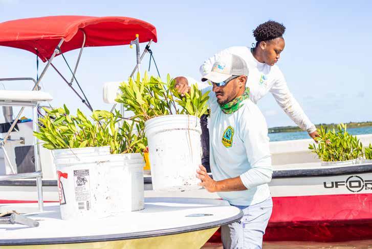 I’ve been planting with BTT for three years, and the Perry Institute for two years. Sometimes we carry 1,700 plants, and sometimes we carry 30,000 propagules—you can probably fit 500 of those in one five-gallon bucket. With Justin Lewis [BTT Bahamas Research Manager], we carry the plants that already have roots and leaves. With Perry, we pick the seeds, called the propagules, off the tree and disperse them along the shoreline through the mangroves. They float right into the shoreline, and the tide comes in and pushes them into the mangroves, and that’s where they grow.