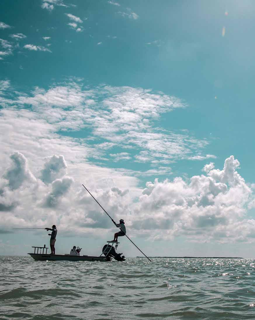 The islands of Tres Marias and Iguana form the perfect backdrop for a skiff. Photo: Marc MontocchioIn addition to permit, there are two other species of fish that attract the visiting fly-fisherman, bonefish and tarpon. Schooling bones are common in both bays and are generally easily found by the expert guides. They spawn offshore, returning back to the shallow flats for the majority of their lifecycle.