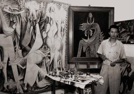Wifredo Lam in his studio, Havana, 1947. Seen in front of Le présent éternel (1944) and The Wizard of the Ocean (1947) Courtesy Eskil Lam