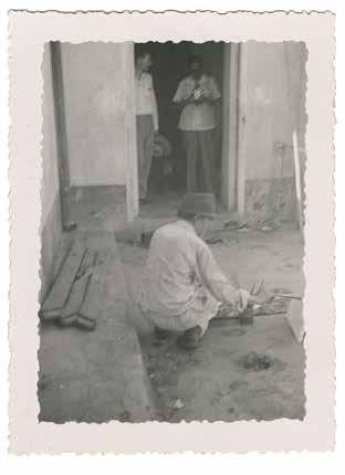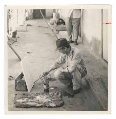 3. Fidelio Ponce, photographed by José Gómez Sicre, painting on the floor, as was his customary practice. In the background, Alfred H. Barr Jr. and Edgar Kaufmann Jr. can be seen, with Kaufmann simultaneously photographing the scene from another angle. Vintage gelatin silver print, 3 5/8 x 2 5/8 in.
