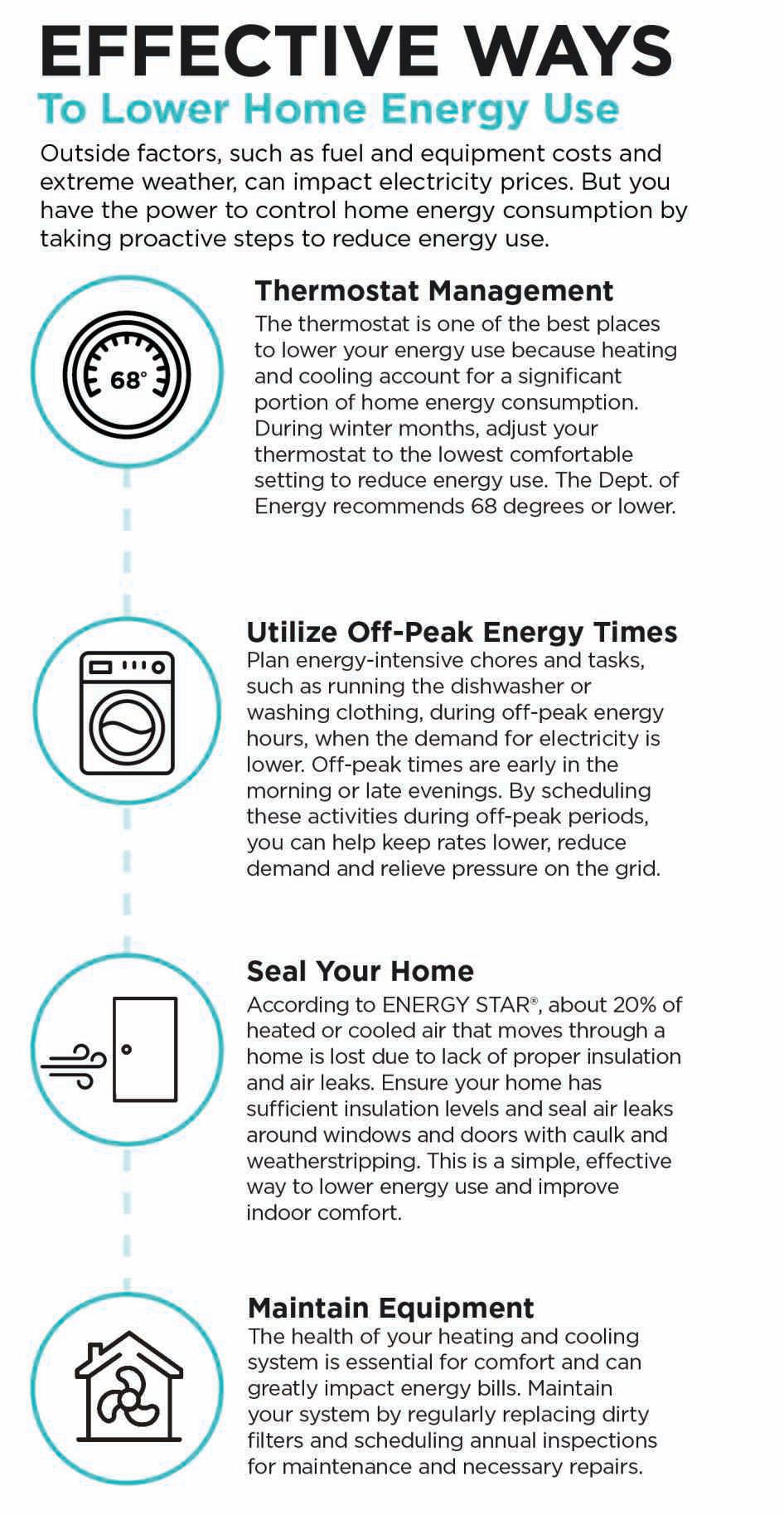 • Thermostat Management: Heating and cooling account for a significant portion of home energy use. Lowering your thermostat to the lowest comfortable setting can lead to meaningful savings. Be sure to service your HVAC system annually and replace filters as needed.