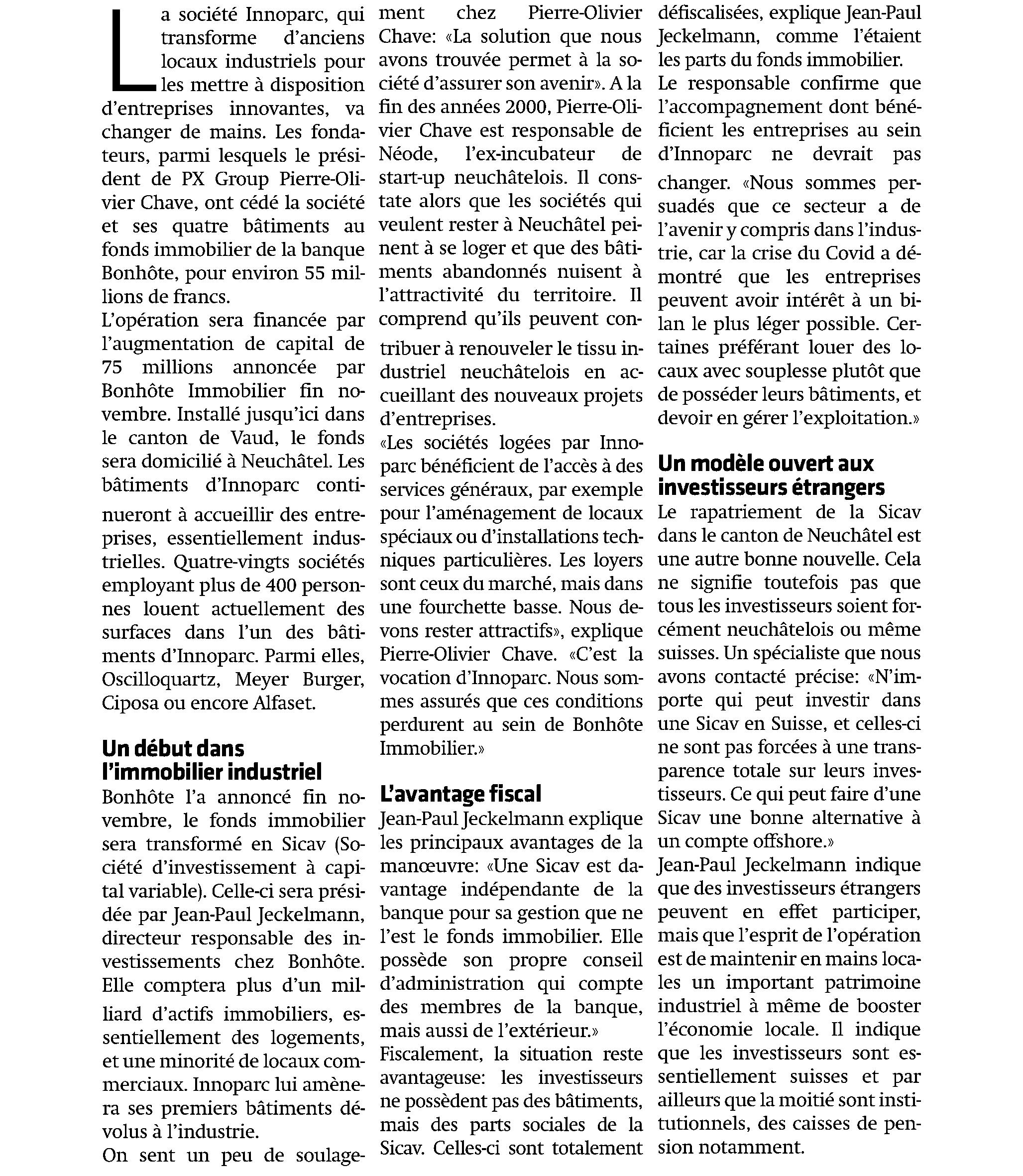 appelle cash-flow qui consiste à maximiser les cash-flows au détriment de la pérennité, par exemple en économisant sur les frais d’entretien. En ce qui nous concerne, nous avons une approche que je qualifierai de patrimoniale: nous voulons favoriser une certaine qualité de construction, laquelle permettra de voir s’y succéder plusieurs générations. Nous disons «dans la mesure du possible», car nous ne pouvons pas toujours acquérir des immeubles qui respectent entièrement cette stratégie. Nous souhaitons aussi saisir des opportunités, comme avec les Innoparc. Il s’agit d’un ensemble de biens qui sont exploités en tant qu’hôtel d’entreprises. Nous avons régulièrement des start-up qui sortent du pôle innovation Microcity à Neuchâtel et qui y louent ensuite des surfaces. Pour que cela fonctionne, il faut connaître les besoins, les intervenants. A Neuchâtel, nous entretenons des contacts directs avec les responsables de la promotion économique. Nous avons acquis cette structure parce qu’elle se trouve dans