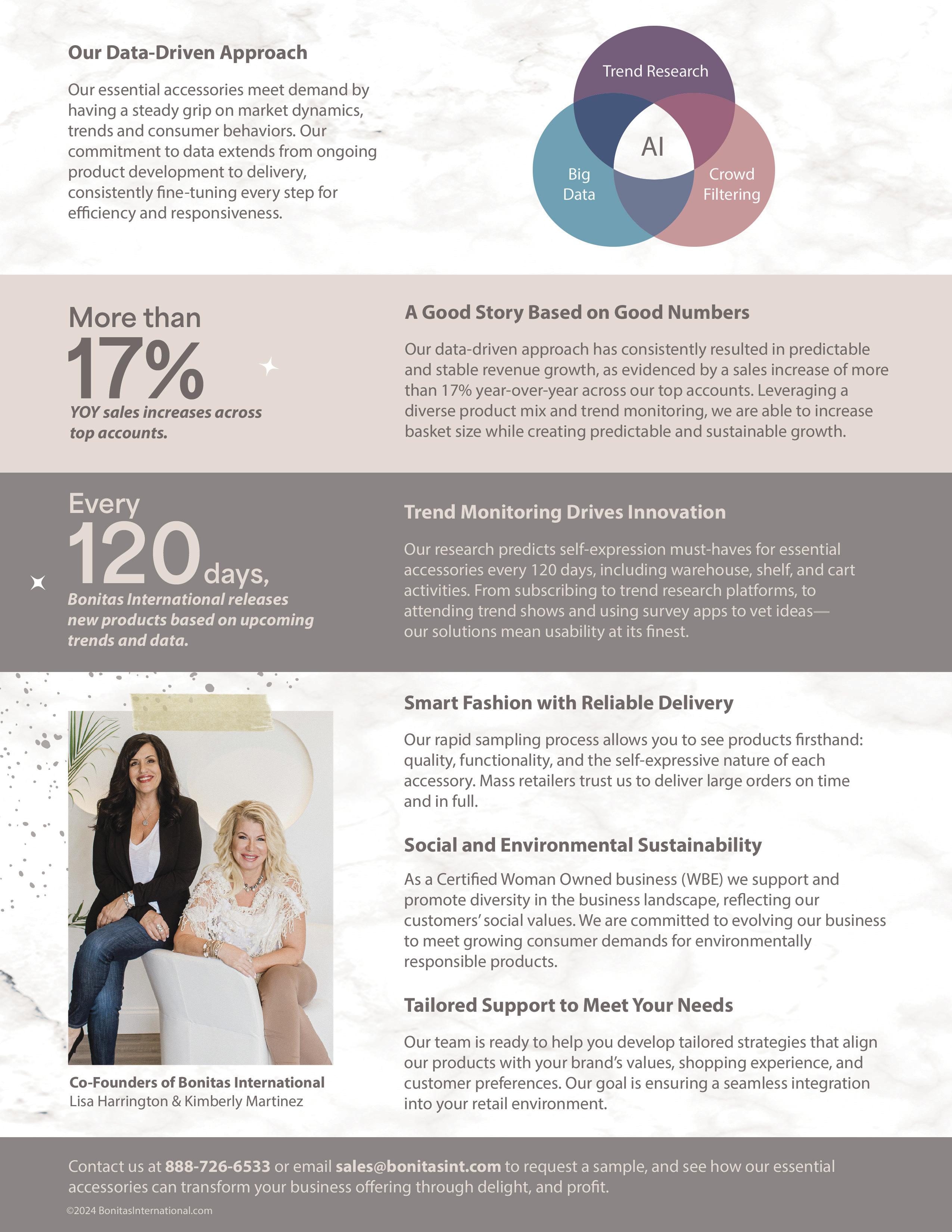 PRODUCT QTY COST MSRP Gold Shimmer Badge Reel 4 $6.50 $14.99 Love Always Badge Reel 4 $6.50 $14.99 Rosette Badge Reel 4 $6.50 $14.99 Candice ID Necklace 10 $6.50 $14.99 Esme ID Necklace 10 $6.50 $14.99 Paris ID Necklace 10 $6.50 $14.99 Black Keychain Wallet 10 $4.50 $9.99 Silver Keychain Wallet 10 $4.50 $9.99 3 Pk Clear Pockets (12 pcs) 12 $3.50 $7.99 Display FULLY MERCHANDISED HALF SIDEKICK WARNING: Keep out reach children. Not toy. Incorrect use could create choking hazard. May cause serious fatal injury used in @boojeebeads WARNING: Keep out reach children. Not toy. Incorrect use could create choking hazard. May cause serious fatal injury used in @boojeebeads WARNING: Keep out of reach children. Not toy. Incorrect use could create choking hazard. May cause serious fatal injury used @boojeebeads Accessories Mix n’ Match by bonitas OVERALL PROGRAM COST: RETAIL: MARGIN: $405 $925.26 56.2% 74 TOTAL PIECES