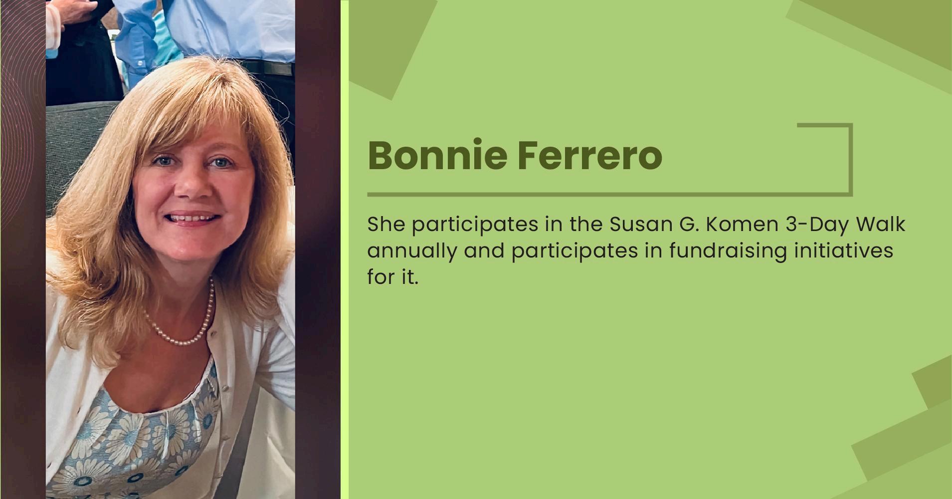 As a proud mother of three sons and a rescue dog, Bonnie's life outside her career is just as significant as her accomplishments at work She has a deep-seated love for community service and has held various positions at her local Lutheran church, from the council to the choir and even as a Sunday school teacher
