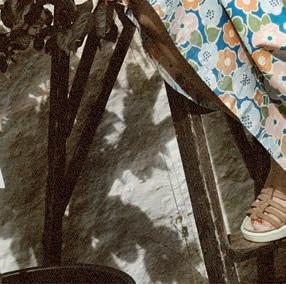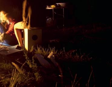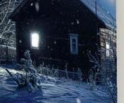 Daniel går in i det lilla huset. Det är svårt att få överblick, skenet från vännernas pannlampor addrar kors och tvärs. Han stäl-