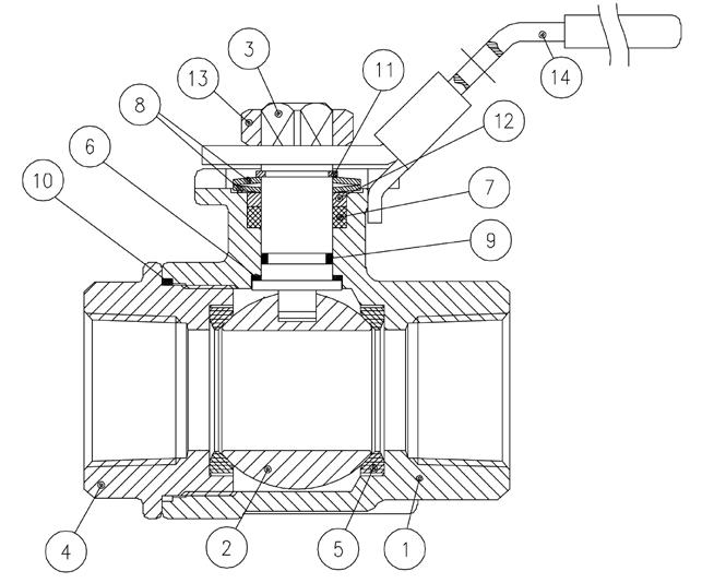 Part description Qty Material 1 Body 1 ASTM A351-CF8M 2 Cap 1 ASTM A351-CF8M 3 Ball 1 ASTM A351-CF8M 4 Stem 1 ASTM A276 Gr.316 5 Seat 2 ME-PTFE* 6 Gasket 1 ME-PTFE* 7 Thrust washer 1 ME-PTFE* 8 Packing 1 ME-PTFE* 9 Gland 1 ASTM A351-CF8 10 Stopper 1 SS304 11 Snap ring 2 SS304 12 Gland bolt 2 ASTM A193 Gr.B8 13 Handle 1 ASTM A536 Gr.65-45-12 Features: Code 135IF0 135MF0 135NF0 Size 2” 3” 4” A 1.50 2.56 3.15 B 7.0 8.0 9.0 E 1.65 2.20 2.20 E1 1.02 1.44 1.44 d 1.97 3.15 3.94 G 0.06 0.06 0.06 H 4.75 6.00 7.50 K 6.00 7.50 9.00 T 0.62 0.75 0.94 M 0.75 0.75 0.75 N 4 4 8 P 2.76 4.02 4.02 S 0.67 0.87 0.87 L 9.13 12.87 12.87 H1 4.96 5.98 6.30 h M8*P1.25 M10*P1.5 M10*P1.5