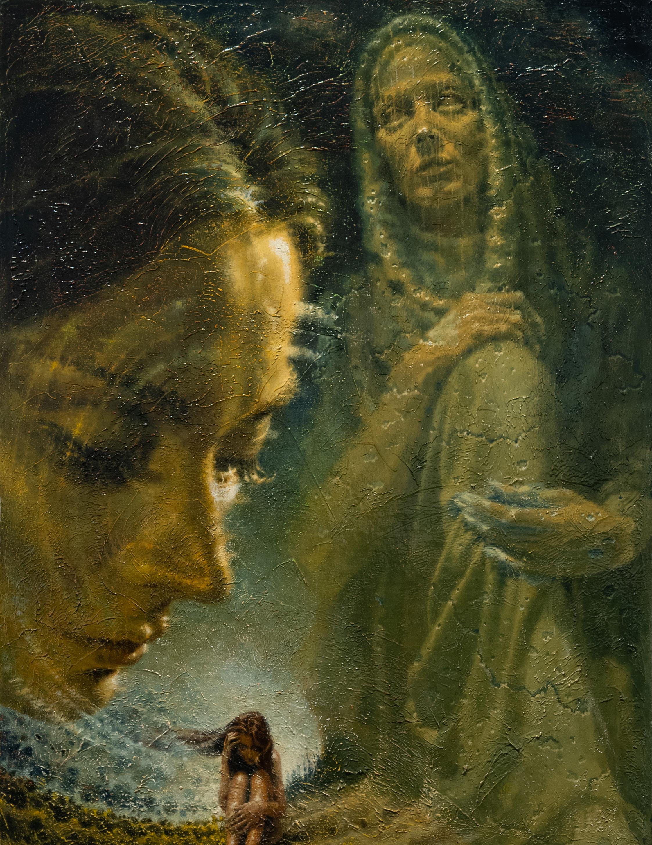 If you look at the canvas from a horizontal position, with the Boobis figure beseeching you at the top, you will see little Billy in the casket, which is closing its lid on the entire Boobis family. From the vertical position, you can see the figure of Billy in the upper left-hand corner with an image of the artist reaching towards his now lost son. This painting was meant as a loving tribute to immortalize his child, and to also show the fragility of life.