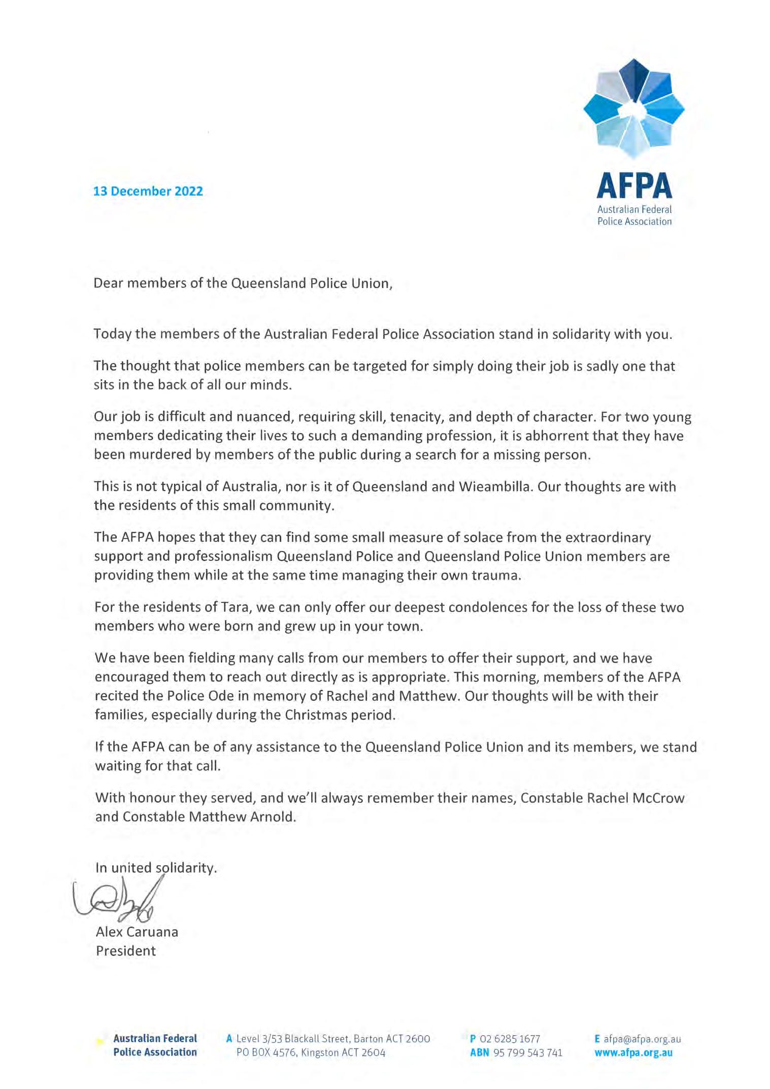The AFPA attended the memorial service for Rachel and Matthew in Brisbane last month, laying a wreath on behalf of the Association and our membership.