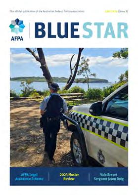 BlueStar April 2024 04 TABLE OF CONTENTS April 2024 issue AFPA 2023 Muster review Australian Police Medal (APM) recipients 16 18 President’s report Member Services report Legal and Industrial report 08 10 12 An overview of the timeline for Protected Industrial Action Seeking legal or industrial assistance? 32 34 Special features News and reports Resources