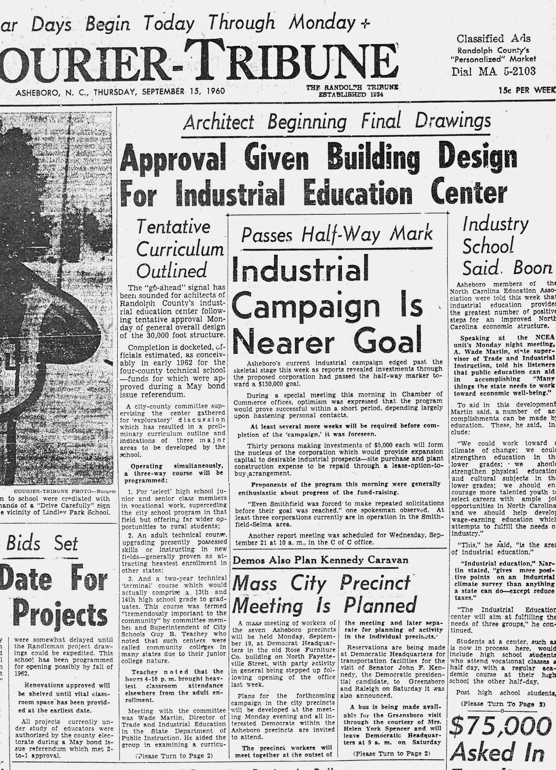January 27, 1960, that the board was contemplating a call for a $3,500,000 school bond election to benefit both Asheboro and Randolph County schools. The first $350,000 would be used to construct a building for the Randolph Industrial Education Center (IEC). A seven-acre tract of land near the intersection of Albemarle Road and Park Street northwest of Asheboro High School was provided at no charge to Randolph County taxpayers by the Asheboro School Board. The industrial education center was described as filling a critical need for the area, as it provided technical training in industrial skills for high school students and night classes for adults who desired to “upgrade” their skills in their current positions or train for a new vocation. The county and city school administrative units would provide a building on land provided at no cost to the County, and the State would equip the building with $150,000 worth of equipment, pay for its operation, and provide trained technicians as instructors. The IEC would provide training in basic industries (oriented to local manufacturing) for county high school graduates who were unable to attend two- or four-year colleges or business schools, or whose employment prospects were only as unskilled laborers or in military service. An editorial titled “School Bond Issue Incorporates Vast Improvements to Schools” in the May 26, 1960, edition of The Courier Tribune expressed, “There would be a ready market for services of young men with one or more years of special training with industrial machinery. The benefits of the industrial training center would be felt county-wide.” Admission would be open to county residents on an equal basis. No tuition would be charged to residents of Randolph County, while residents of Anson, Montgomery, Stanly, and other counties would be charged a tuition fee. Both day and night classes would be available, and adults desiring to learn a certain trade would be eligible to attend as well as high school students.