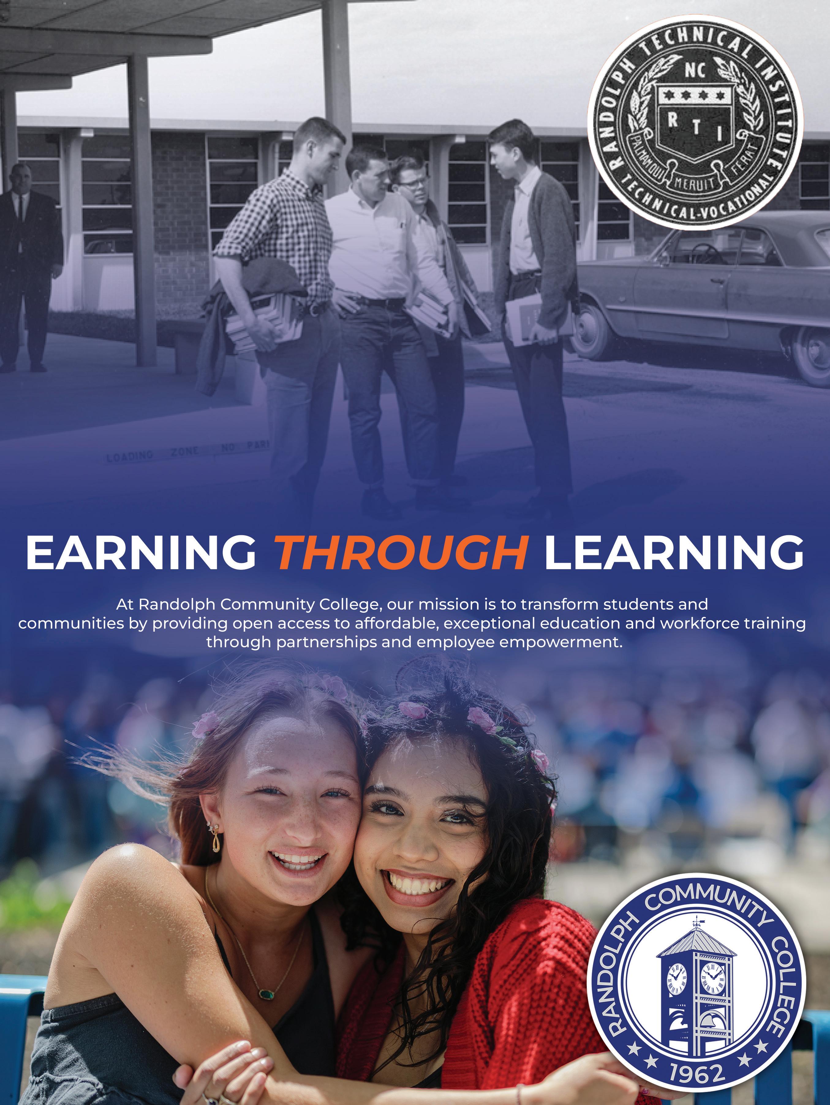 In 1961, Randolph Community College’s first slogan, “Earning Through Learning,” was printed on the first brochure to publicize the new Randolph Industrial Education Center, which opened its doors to students on September 4, 1962. When It opened, the mission of our college was to provide pre-employment and up-grading training for trade and technical occupations for both high school students and adults. Sixty-two years later, Randolph Community College remains committed to our mission as an integral engine of socioeconomic prosperity through significant workforce development services to business and industry, extensive college-transfer programs, technical and trade programs, and community development. Our nationally recognized Apprenticeship Randolph Program is a prime example of “Earning Through Learning,” as students in this program truly do earn while they learn. Randolph Community College has supported local business and industry since 1962 and is now also serving as a lead workforce development partner with Toyota North Carolina, with their $14 billion investment in the county.