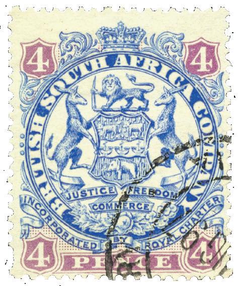 Above and below Stamps issued during the 1890s by Rhodes’s British South Africa Company for use in Rhodesia. Note the company’s motto “Justice, Commerce, Freedom” and the boast of incorporation by Royal Charter. continued