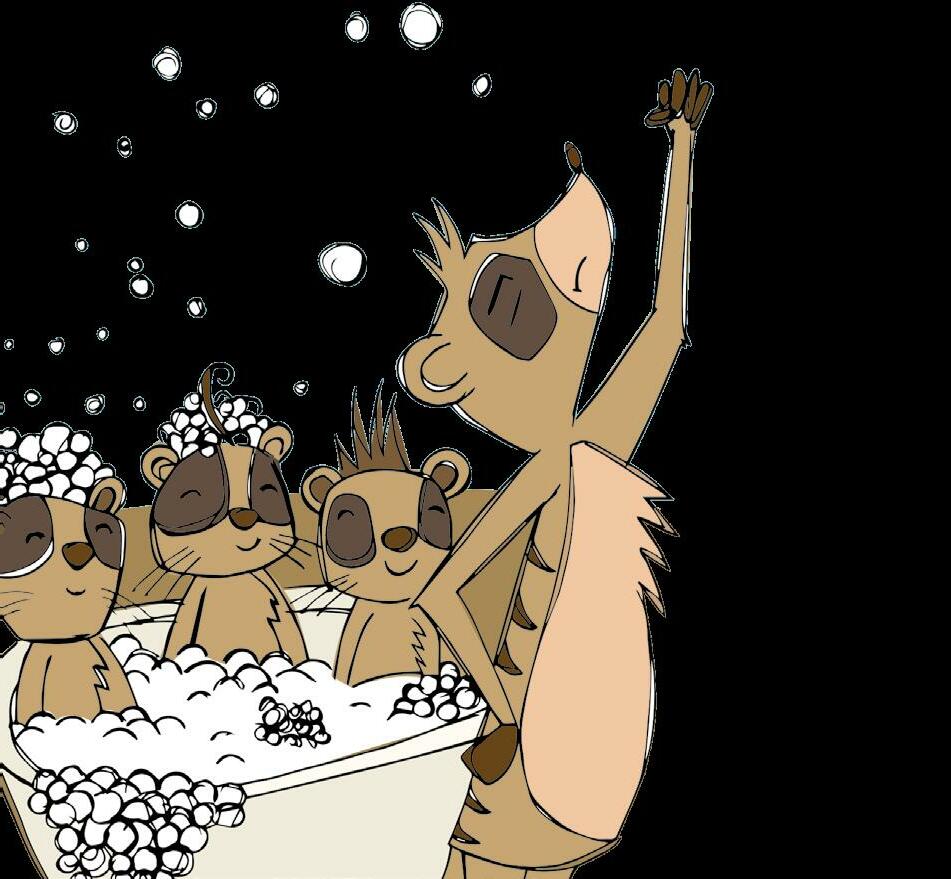 “Be careful! You nearly kicked me!” says Meerkat, bathing his babies. “Go and dance somewhere else.”