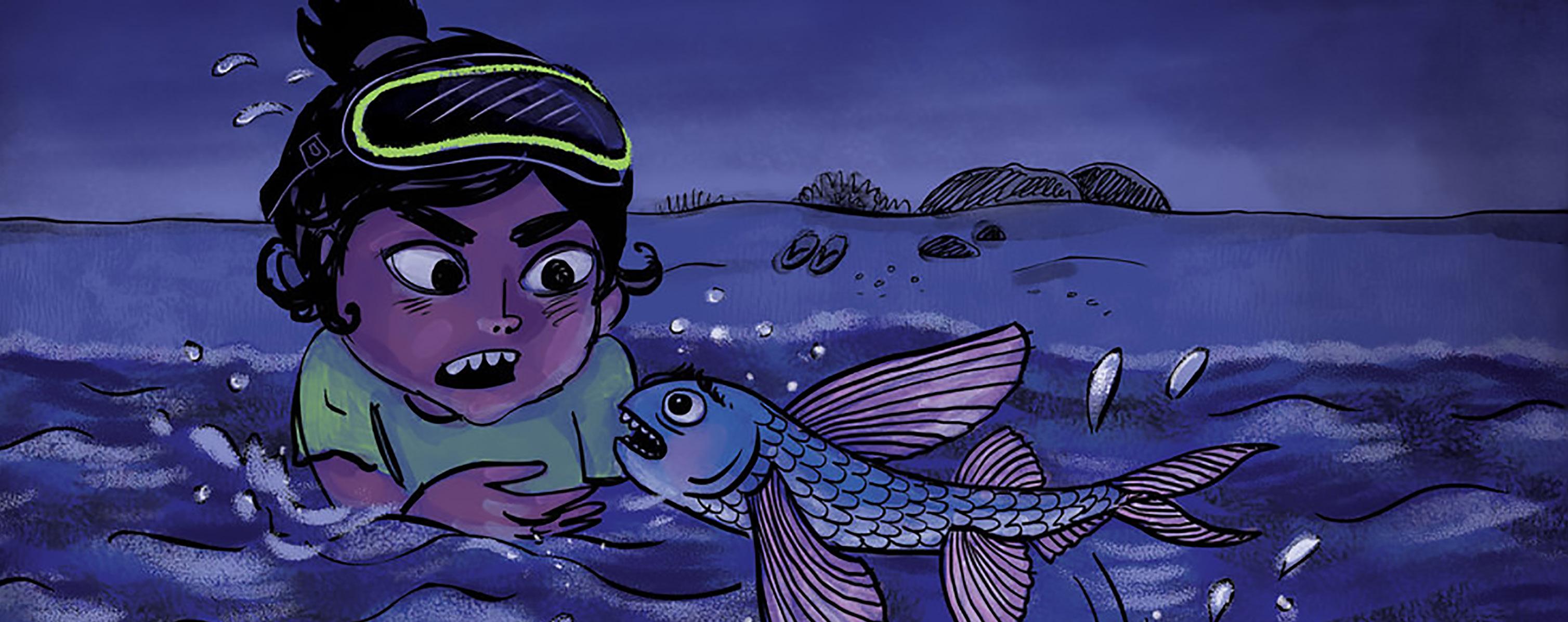 Maisha goes to their usual meeting place on the beach and calls out. “Uchli! Are you here?” She can sit here for hours, watching Uchli fly in and out of the water. Uchli is a flying fish who loves to show off his tricks.