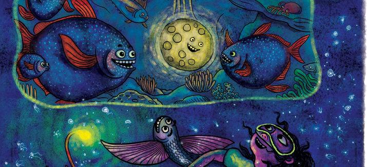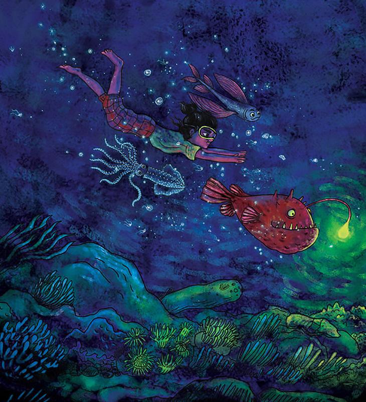“I can help you,” a deep, booming voice says, near Maisha’s ear. She spins around. The eight arms of a firefly squid glimmer back at her. His body is covered in neon-blue lights. “I saw the moon go this way just a little while ago.”