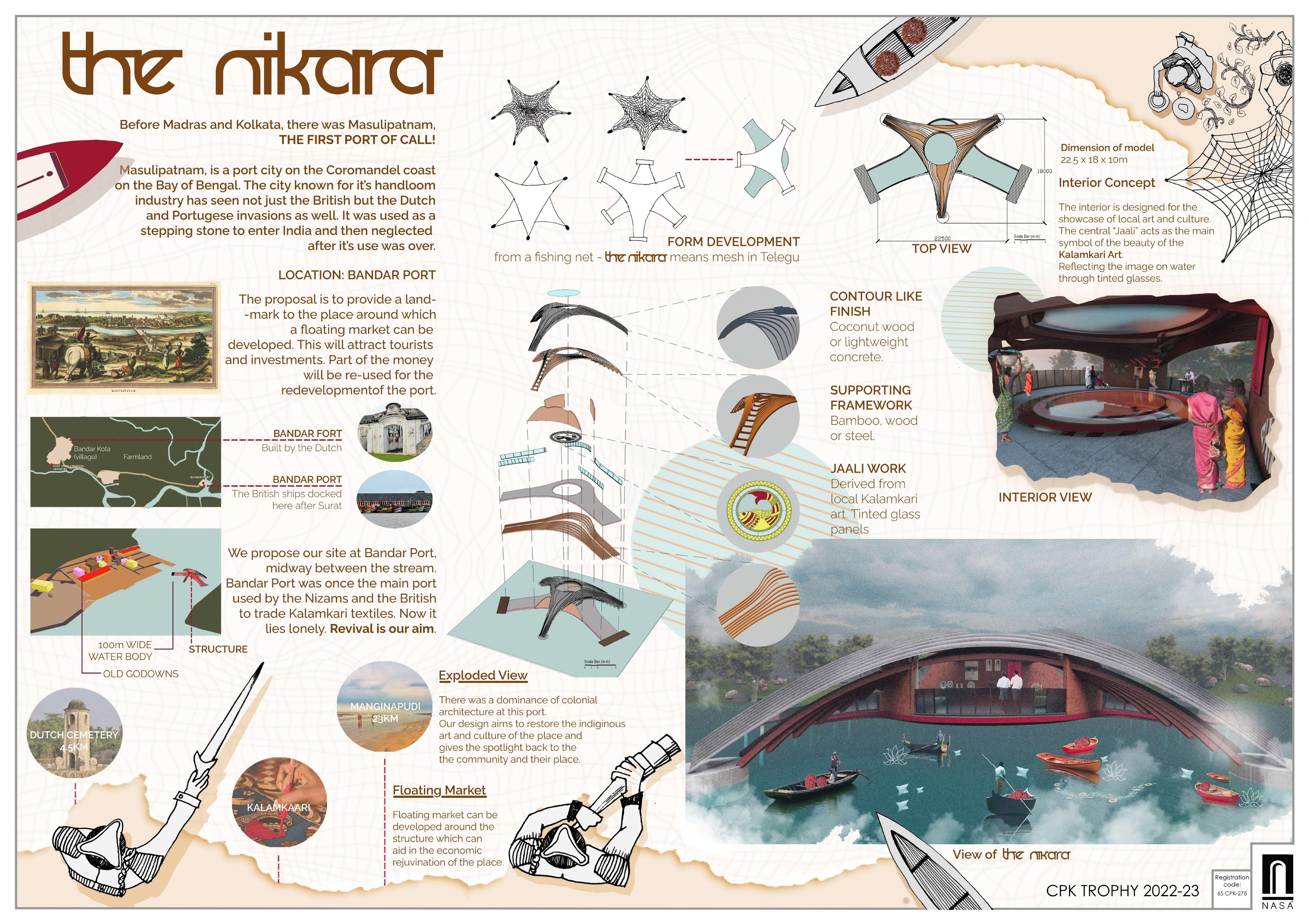 The aim of the project was to design a landmark to revive the areas which lost their importance after end of British rule. The bridge acts as a focal point for tourist and fishermen community serving to formulate a floating market The bridge incorporates use of local materials and traditional paintings and motifs in interior.
