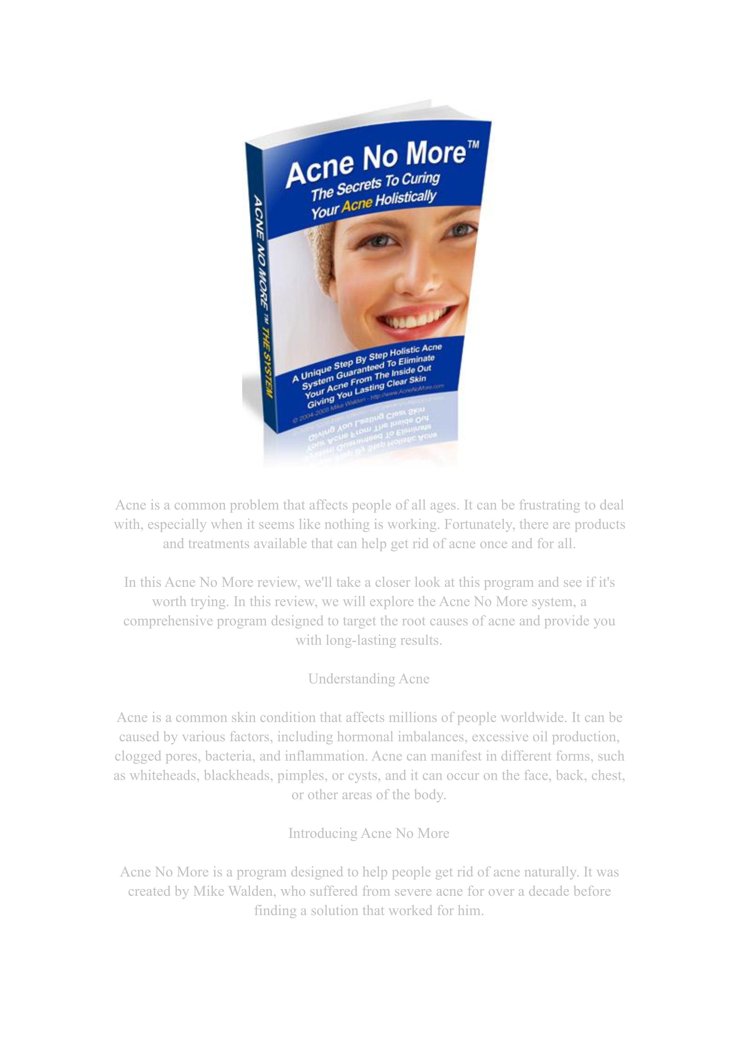 Acne No More is a program designed to help people get rid of acne naturally. It was created by Mike Walden, who suffered from severe acne for over a decade before finding a solution that worked for him. The program is based on a holistic approach to acne treatment, which means it focuses on treating the underlying causes of acne rather than just the symptoms. This program takes a holistic approach to treating acne by addressing the underlying causes rather than just focusing on the symptoms. It provides you with a step-by-step roadmap to achieve clear and healthy skin. Unlike many other acne treatments that only focus on external factors, Acne No More takes into account the overall health of your body. It emphasizes the importance of balanced nutrition, stress management, and lifestyle changes to promote clear skin.