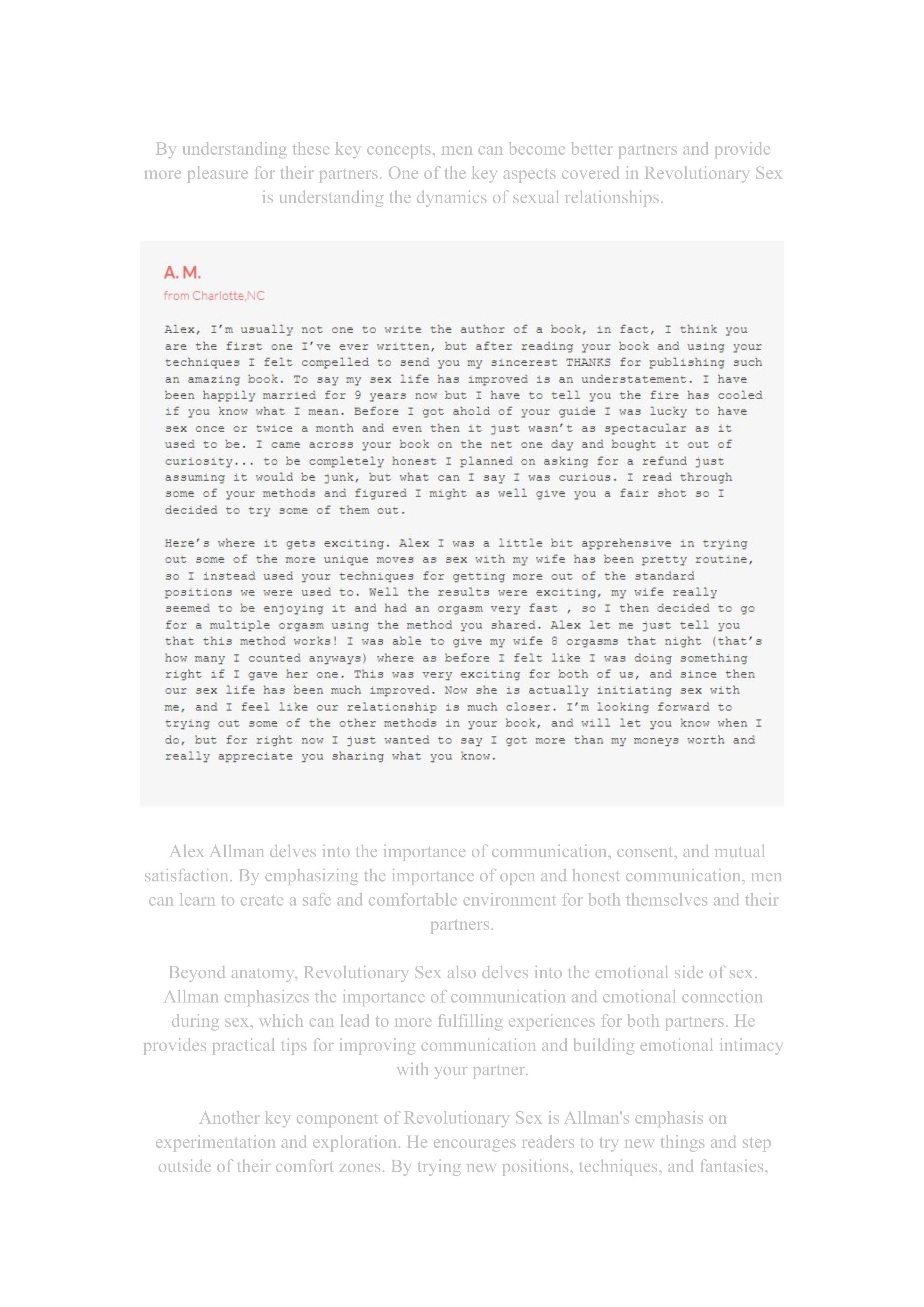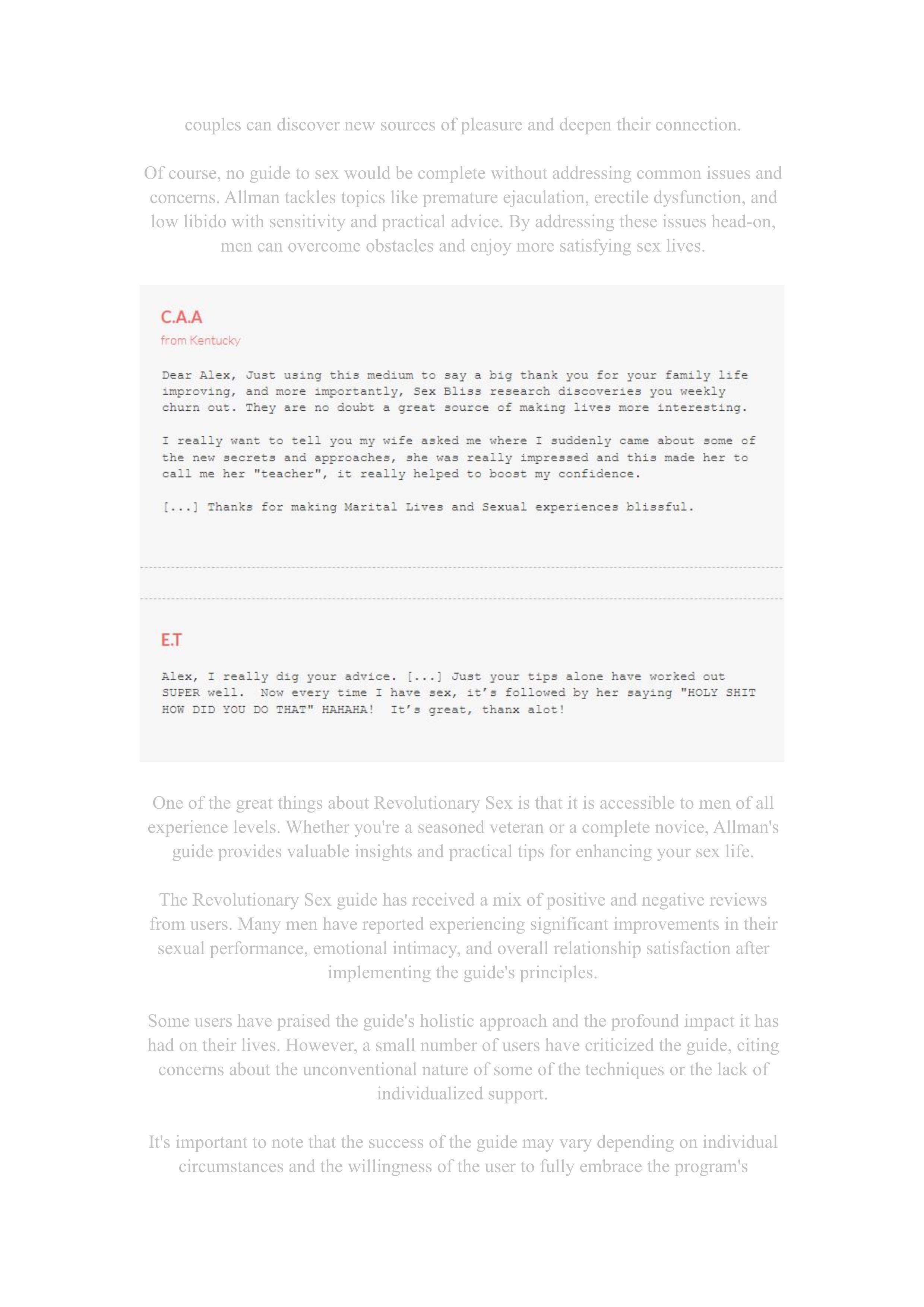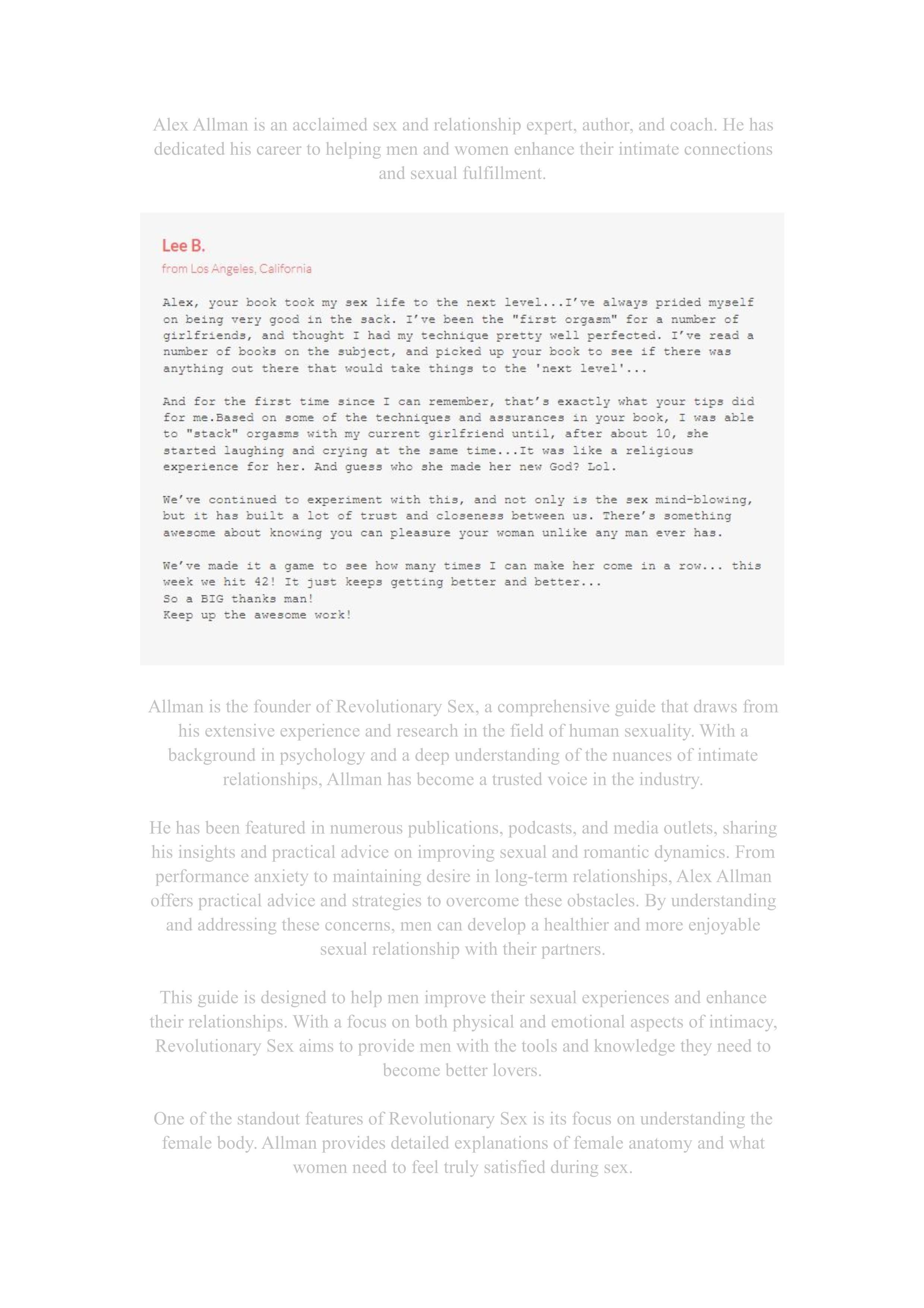 Revolutionary Sex is a comprehensive sex guide for men created by Alex Allman. Alex Allman is an acclaimed sex and relationship expert, author, and coach. He has dedicated his career to helping men and women enhance their intimate connections and sexual fulfillment. Allman is the founder of Revolutionary Sex, a comprehensive guide that draws from his extensive experience and research in the field of human sexuality. With a background in psychology and a deep understanding of the nuances of intimate relationships, Allman has become a trusted voice in the industry. He has been featured in numerous publications, podcasts, and media outlets, sharing his insights and practical advice on improving sexual and romantic dynamics. From performance anxiety to maintaining desire in long-term relationships, Alex Allman offers practical advice and strategies to overcome these obstacles. By understanding and addressing these concerns, men can develop a healthier and more enjoyable sexual relationship with their partners.