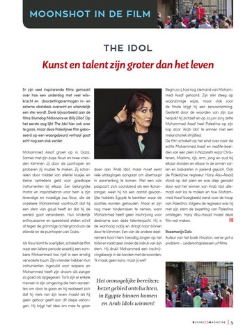doen aan ‘Arab Idol’, maar moet eerst vele uitdagingen aangaan om überhaupt in aanmerking te komen. Met een vals paspoort, zich voordoend als een Koranzanger, weet hij na een aantal gevaarlijke hobbels Egypte te bereiken waar de audities worden gehouden. Maar er zijn nog meer hindernissen te nemen, want Mohammed heeft geen inschrijving voor deelname aan deze talentenjacht. Hij is de wanhoop nabij en dringt naar binnen door te klimmen. Een van de andere deel- Rozemarijn Dols nemers hoort hem toevallig zingen op het Auteur van het boek Houston, we’ve got a toilet en raakt zeer onder de indruk van zijn problem – Leiderschapslessen uit films. stem. Hij drukt Mohammed een inschrijvingsbewijs in de handen met de woorden: ‘Ik maak geen kans, maar jij wel!’
