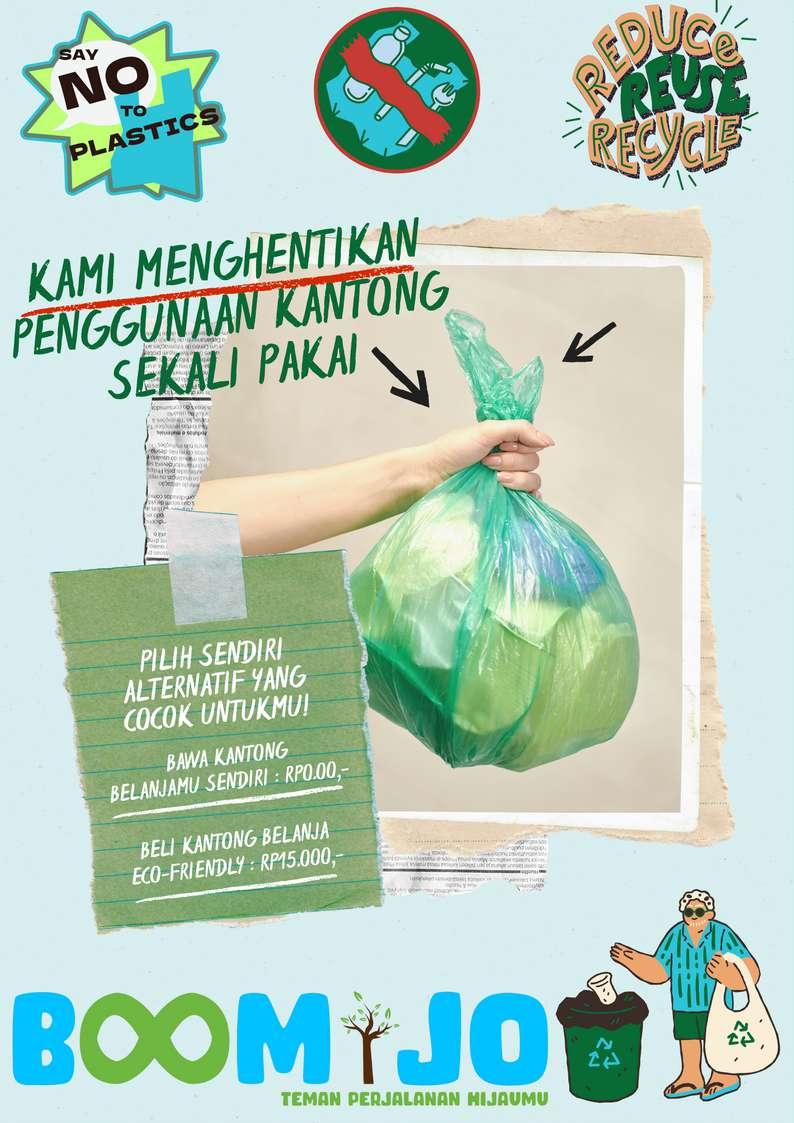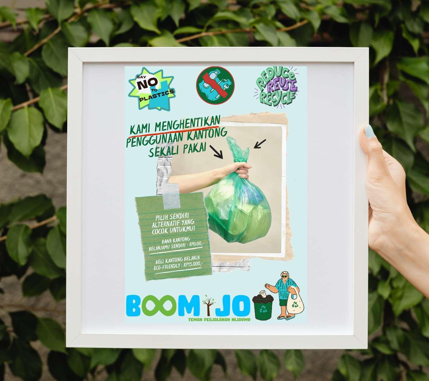 Poster BOOMIJO ini merupakan poster afirmasi yang berusaha memotivasi masyarakat untuk menghentikan penggunaan kantong plastik sekali pakai. Selain itu, BOOMIJO juga