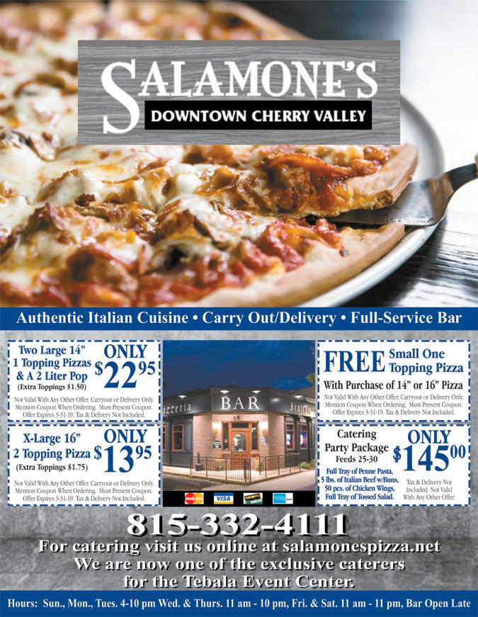 Boone County Shopper - Belvidere, Illinois - February 29, 2024 Page 2 Simply Perfect WEDDING INVITATIONS Created just for your big day, we've put together sets of stunning wedding invitations to perfectly match your style. www.printingbypennylane.com ginad@pennylaneprinting.com Scan our QR code to find your perfect invitation! F R E E F O O D Wednesday March 6th 9:15 - 11:15 A.M. at the S A LVAT I O N A R M Y 4 2 2 S M a i n , B e l v i d e r e P e r s o n / F a m i l y M u s t L i v e I n B o o n e C o u n t y T H E S A LVAT I O N A R M Y S U P P L E M E N TA L F O O D P R O G R A M $39.95 Super Softener Tune-Up Special New customers only. EXP. 3-6-24. www.affordablewaterinc.com 815-544-0918 • 214 W. Menomonie, Belvidere AFFORDABLE WATER Does Your Culligan Equipment Need Service? We Service ALL Makes & Models Hard Rusty Water? WE CAN HELP!!! Affordable Water Wants To Be YOUR PREFERRED LOCAL WATER TREATMENT PROVIDER! FREE Lunchtime Specials 11am - 3pm Daily 1610 N. STATE ST., BELVIDERE • 815-323-5058 • Open Daily 10 AM - 10 PM FREE Single Cheeseburger Combo Meal Valid from 11 AM-3 PM. Not valid with other offers. Limit one coupon per customer per day. Belvidere location only. Expires 4-30-24. Valid from 11 AM-3 PM. Not valid with other offers. Limit one coupon per customer per day. Belvidere location only. Expires 4-30-24. Valid from 11 AM-3 PM. Not valid with other offers. Limit one coupon per customer per day. Belvidere location only. Expires 4-30-24. FREE FREE Small Fries Mini Blizzard Free Estimates TAX RETURN SPECIALS ON FURNACES & A/C Carey Heating & Air Furnace Clean & Check Special Electrical & Plumbing Services Available 815-222-2316 815-319-2465 Following COVID-19 Precautions To Keep You & Your Family Safe. • CARPET • TILE • UPHOLSTERY • HARDWOOD Call or Text 815-601-2501 C L E A N E R S C L E A N E R S CLEANERS Family Owned & Operated Since 1937 SocietyStacey@gmail.com Local Woman Owned Proudly Serving The Stateline Stacey Friedl Burger Owner SocietyCarpetCleaners.com 815-544-6640 Call for estimates 7200 Epworth Rd., Garden Prairie, IL Sand, Gravel, Excavating and Ready Mix Concrete MON. - FRI. 7AM - 5PM SAT. 7AM - 12PM CORDRAY BROTHERS, INC . NJETree Service & Landscaping, Inc. 15% OFF Jobs Over $800 Some Restrictions Apply. TREE REMOVAL OAK PRUNING TREE CABLING & BRACING 70’ AIR LIFT BUCKET Fully Insured ~ Free Estimates 815-482-5429 or 708-603-9141 815-943-6629 Household, Boat and RV Storage Sizes Available from 5’ x 10’ thru 25’ x 40’ In CAPRON and POPLAR GROVE! Visit W WW HNHSTORAGE COM If you need the space, we’ve g ot the Place! We Offer Easy Online Payments! 4760 Rt 173 in Poplar Grove And two locations in Capron Main S treet and Wooster Str eet Capron, Illinois YOUR AD HERE STARTING AT ONLY... $51.60 Contact The Boone County Shopper Today At 815-544-2166