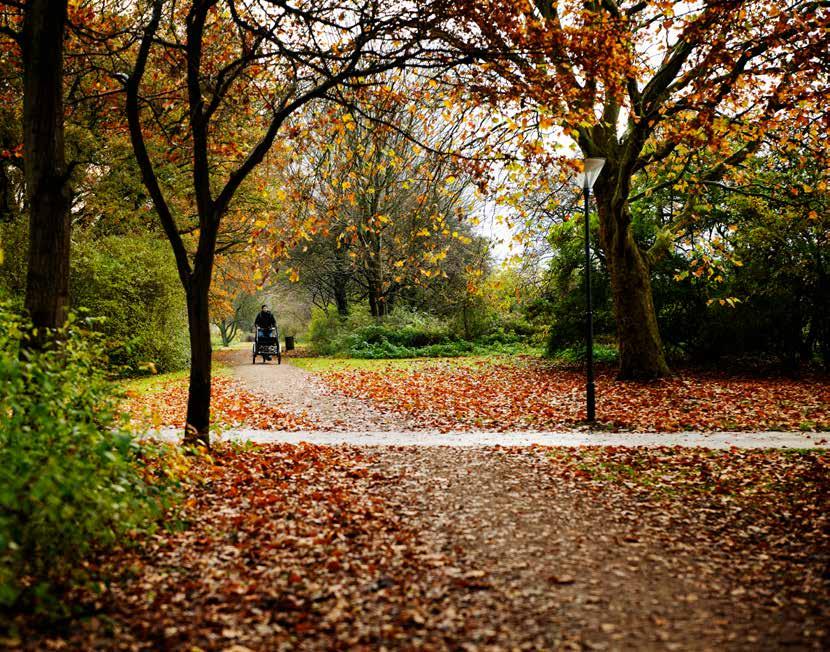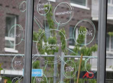 tværs af området med fællesområder, hvor man kan møde sin naboer.