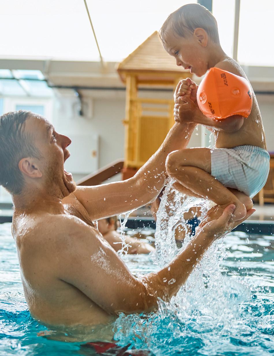 I vores indendørs vandland kan man nyde den subtropiske varme med masser af vandleg. Luften er 32 grader og vandet 30 grader. Det indendørs vandland er også meget mere end sjov og leg. Der er nemlig også plads til velvære, afslapning i forskellige saunaer, dampbad og morgenspa for voksne hver dag. Læs mere om vores tilbud om spaforkælelse på side 14.