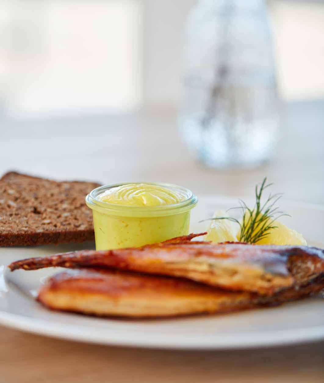 5. Serveres med hjemmebagt rugbrød, citron, dild og remoulade.