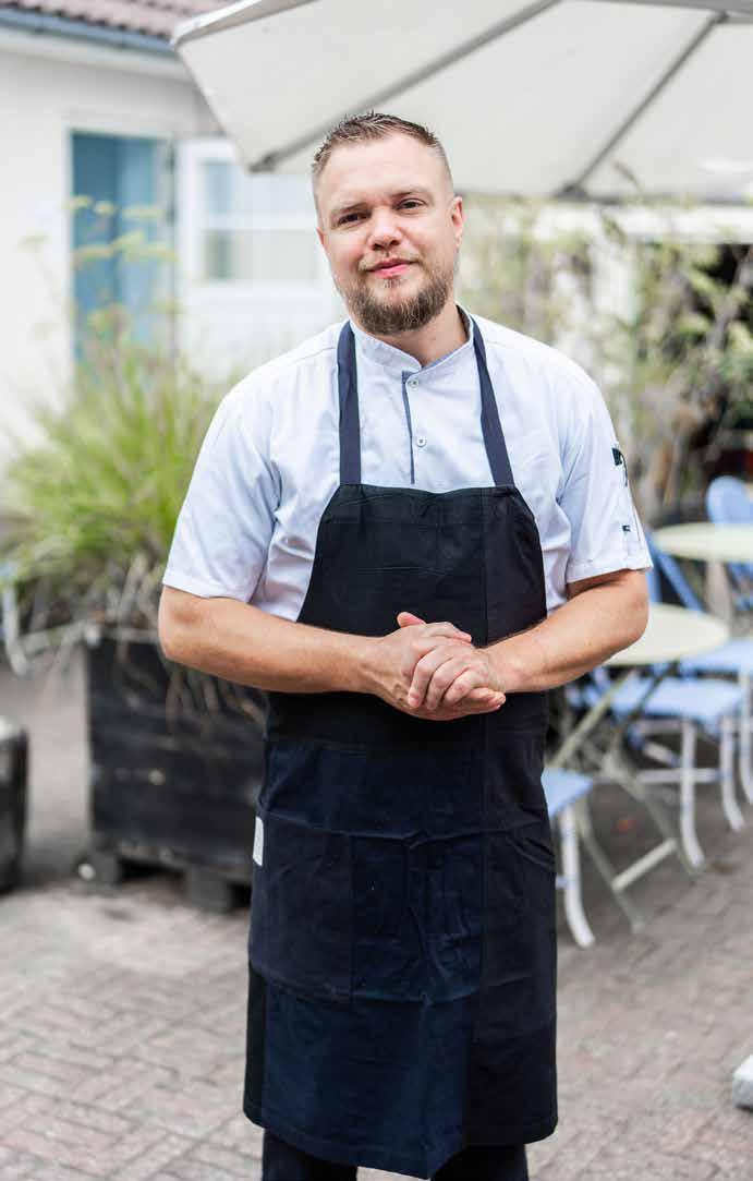 Jeg har været ansat som køkkenchef her på badehotellet siden 2019. Jeg kan huske, at jeg var meget tiltrukket af, at stedet var familiedrevet. Det var meget anderledes end det jeg tidligere havde prøvet. Her får man lov til at have indflydelse på, hvordan man gør tingene. Noget andet, der tiltrak mig, var den vision og ambition, der var for stedet. Jonas og Kathrine ville løfte niveauet i restauranten og gøre maden til en stor del af oplevelsen. Det synes jeg, at vi er lykkedes rigtig godt med.