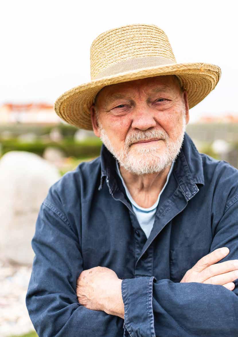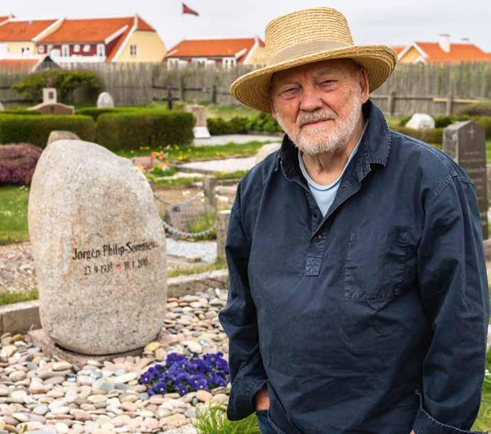 herovre på kirkegården. Han var en rigtig god legekammerat, og jeg savner ham rigtig meget,” forklarer Alfred med en bevæget røst. Det er dog ikke helt slut for de to legekammerater. Der foreligger nemlig en plan for, at de to kan mødes igen i efterlivet. En plan, som Alfred gerne vil visualisere med en lille gåtur fra Strandhuset over til kirkegården, hvor Philip-Sørensen ligger. På kirkegården blæser det, som man på disse kanter kalder en frisk vind, mens Alfred beskuer sin gamle vens sidste hvilested med mange små sten liggende omkring den store gravsten: ”Der er blevet skrevet beskeder til ham på nogle af de mange sten. Blandt andet fra hans børnebørn. Jeg har også skrevet en til ham. Og der i hjørnet skal jeg ligge, når det bliver min tur. Jeg har fået lavet en buste, så jeg kan ligge der og kigge på ham,” forklarer Alfred Hansen og smiler ved tanken om, at han en dag skal møde sin gamle ven igen. ■