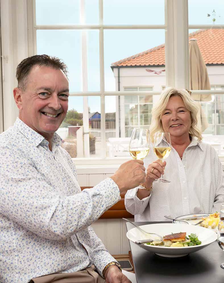 Der bruger vi meget Theresa Roug fra receptionen,” forklarer Sussie, mens Mogens indrømmer, at han også får god hjælp af restaurantchefen Johan Brodersen, når der skal holdes champagne-aften med vennerne: ”Han ved rigtig meget om champagne og vin, så han kan altid finde noget udover det sædvanlige, så vi bruger alle af hotellets facetter. Vi er forelskede i hele Ruths Hotel. Det hele er meget nede på jorden. Det bekommer os godt som jyder.” Med talrige besøg over de sidste 10 år, har de to stamgæster også oplevet de mere udfordrende tider på hotellet. Man kan måske fornemme, at selv ikke coronapandemien kunne stoppe de to fra at besøge Skagen. Det blev dog vendt fra en udfordring til en unik oplevelse: ”Vi måtte selvfølgelig ikke sidde og spise sammen nede i restauranten, så den blev rykket op på værelserne. Der blev dækket op med hvid dug og musik i baggrunden. Så kunne vi sidde og nyde udsigten, mens de kom rendende med mad og vin. Det var noget helt specielt,” fortæller Mogens.