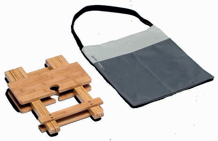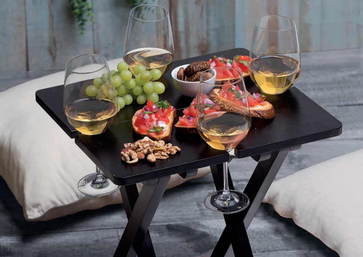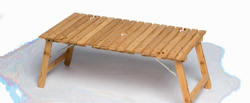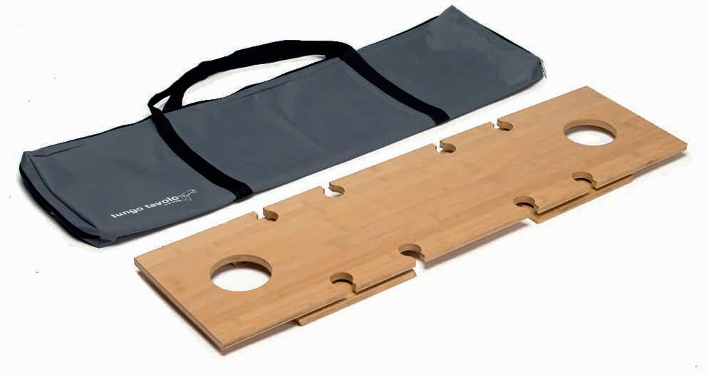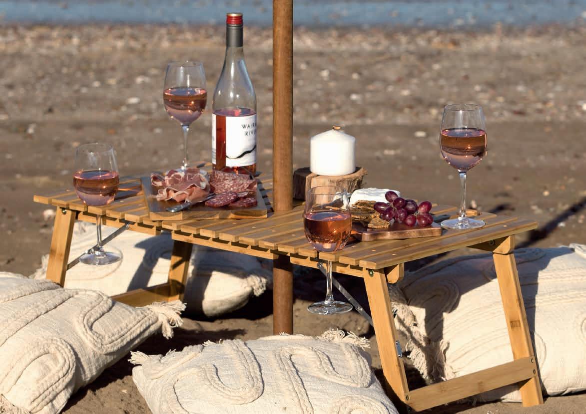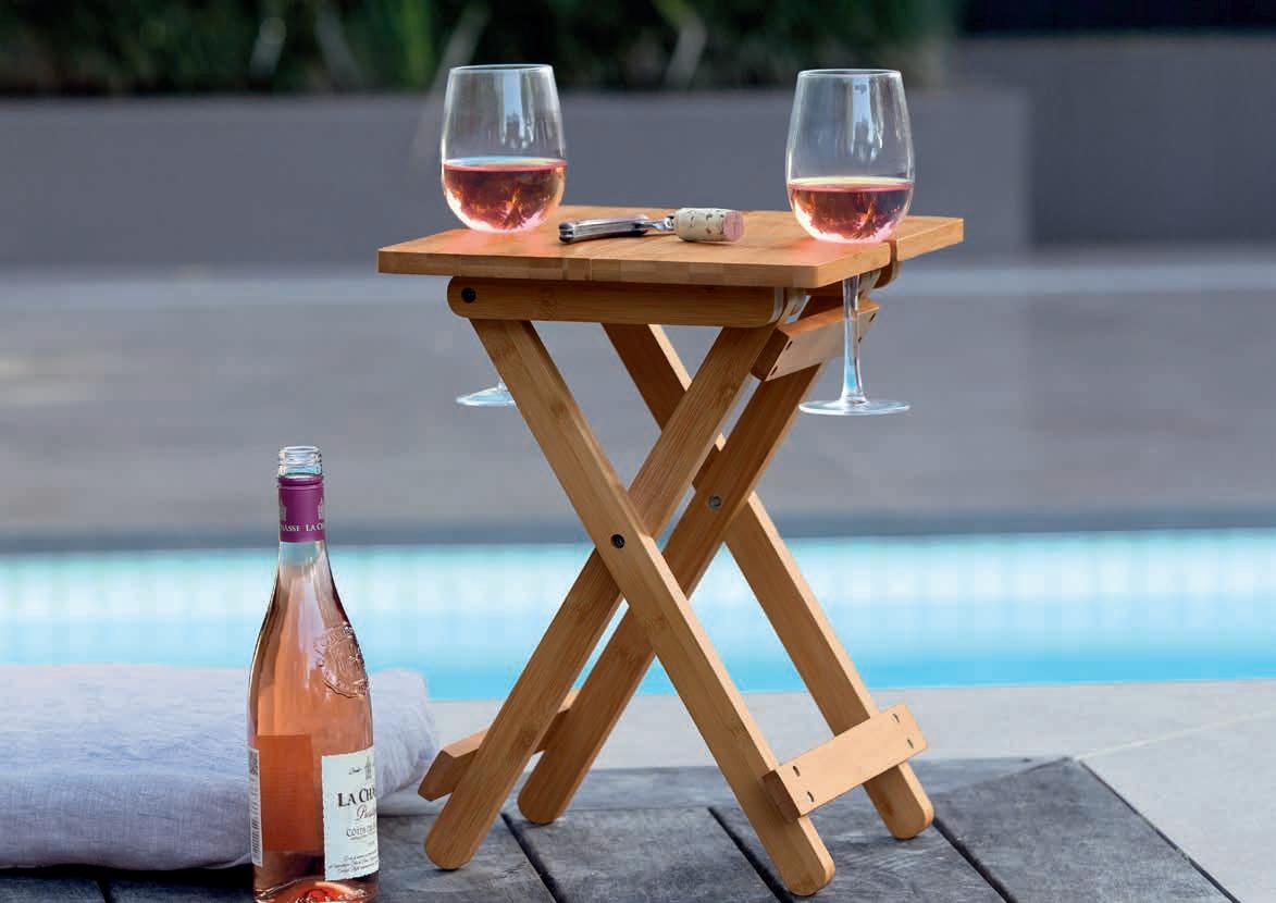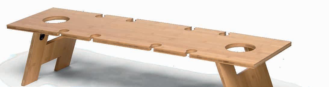 Foldable/packable Bamboo (FSC certified) alfresco table with integrated holders for eight stemmed glasses and two bottles