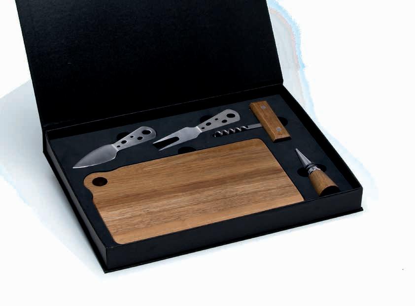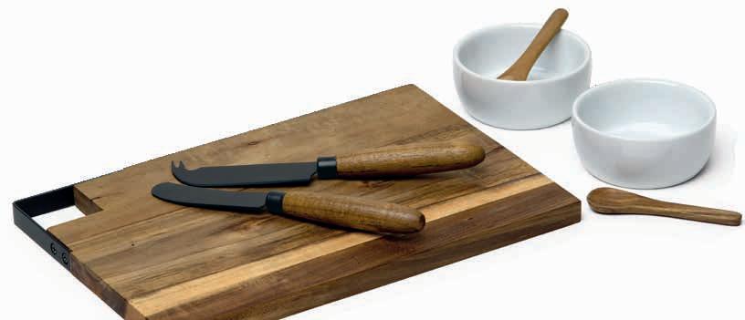 7-pcs set includes plantation grown Acacia hardwood (FSC certified) serving board with metal handle, 2 x acacia spoons, 2 ceramic bowls, matt black Stainless steel 3.5” cheese knife and 3” spreader knife