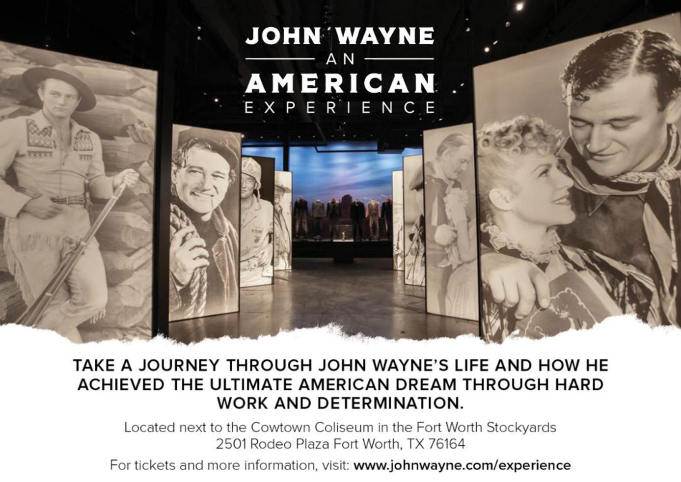 Ongoing John Wayne: An American Experience. Sprawling over 10,000 square feet, the John Wayne: An American Experience exhibit is structured to give an intimate tour of the life of John Wayne. Starting with his early childhood and career, each room highlights an aspect of The Duke’s legacy. For film aficionados, an extensive gallery called the “Life on Screen” highlights the most iconic film props and costumes. All patrons have exclusive access to never-before seen family photos and correspondences which have been thoughtfully curated by the Wayne family in order to give guests a holistic view of the icon, whose values translate both on the silver screen and off. Daily 9 a.m.-6 p.m. 2501 Rodeo Plaza. www.johnwayne.com.