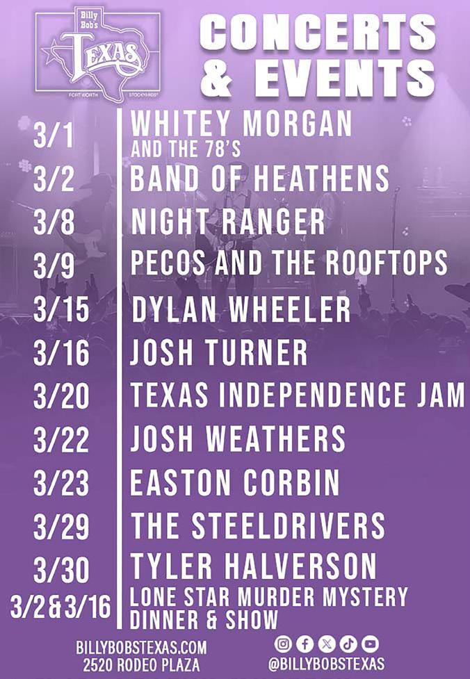 Mar. 16 Josh Turner. Doors 6 p.m. Porter Wayne Band 8 p.m. Headliner 10 p.m. $20$75. Billy Bob’s Texas: 2520 Rodeo Plz. 817624-7117, www.billybobstexas.com/events.