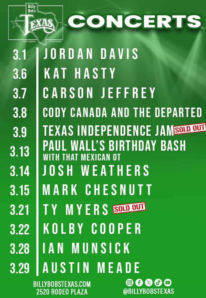 Mar. 9 Texas Independence Day Jam. Lineup Includes Kane Brown, Darius Rucker, George Birge, Zach Top, Lee Brice, Warren Zeiders, Koe Wetzel, Bailey Zimmerman, and more! Doors 2 p.m. Music 5:30 p.m. GA