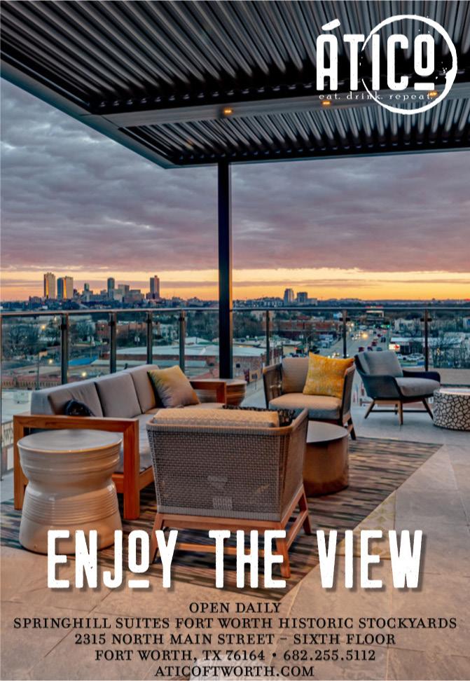 ÁTICO - On the 6th floor of the SpringHill Suites in Fort Worth’s Historic Stockyards sits Ático, Chef Tim Love’s latest, an inviting rooftop eatery and bar with a luxurious feel. The panoramic views of the Stockyards and glim mering lights of downtown are more than enough to keep you coming back trip after trip, but the carefully curated food and drink menu are what sets Ático apart from all the dining options available in the Stockyards. A wide array of Spanish-inspired drink and food options are available to those looking to expand their horizons and take a quick trip to Barcelona. ¡Vamos! Mon.-Fri. 4:30 p.m.-close. Sat.-Sun. 11:30 a.m.-close. 2315 N. Main St. 682-255-5112, www.aticoftworth.com.