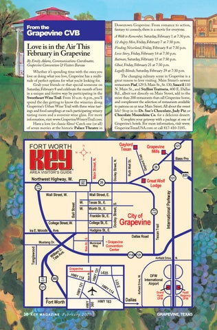 Legally Blonde, Saturday, February 29 at 7:30 p.m. The changing culinary scene in Grapevine is a great reason to love visiting. Main Street’s newest restaurants Piaf, 129 S. Main St., St. 130, Sauce’d 110 N. Main St., and Stellini Trattoria, 400 E. Dallas Rd., albeit not directly on Main Street, add to the more than 200 restaurants that call Grapevine home, and compliment the selection of restaurants available to patrons on or near Main Street. All about the sweet life? Stop in to Dr. Sue’s Chocolate, Judy Pie or Chocolate Moonshine Co. for a delicious dessert. Complete your getaway with a package at one of Grapevine’s hotels. For more information, visit www. GrapevineTexasUSA.com or call 817-410-3185.