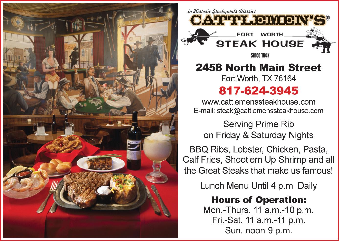 CATTLEMEN’S FORT WORTH STEAK HOUSE: Steak isn’t only for dinner- try the daily lunch menu! You can get a luncheon steak that includes a baked potato, salad, and their famous homemade rolls. Start your meal off with a savory appetizer: “Shoot ’em Up Shrimp,” crab cakes, calf or lamb fries, onion rings, and the list goes on. Cattlemen’s offers BBQ ribs, chicken, pasta, pork chops, a huge seafood selection, and “The Old Texas Standby” chicken fried steak. Prime rib is served on Friday and Saturday nights. Cattlemen’s extensive charcoal-broiled steak selection has been called “the ultimate in a fine steak” and can be ordered with a variety of enticing sauces like cognac pepper corn or gorgonzola. Top off your dinner with a homemade dessert: apple or pecan pie, cobbler, banana pudding, chocolate cake, or New York-style cheesecake. Private banquet rooms offer seating for 10-120 guests. Mon.-Thurs. 11 a.m.-10 p.m. Fri.-Sat. 11 a.m.-11 p.m. Sun. noon-9 p.m. 2458 N. Main St. 817-624-3945, www. cattlemenssteakhouse.com.