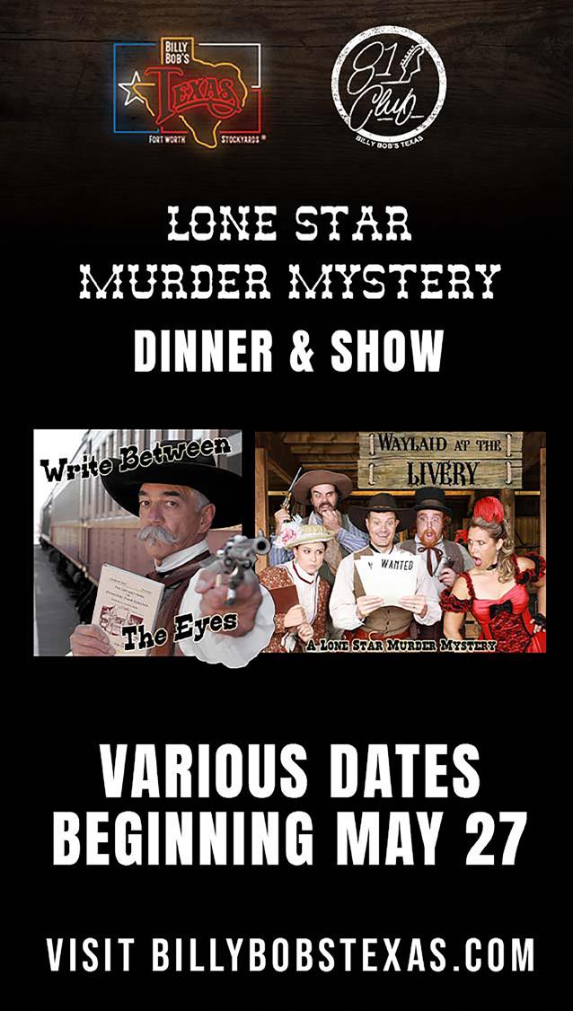 May 27 Lone Star Murder Mystery Dinner & Show. Stop that train! The railroad tycoon, Horace Grimsby has been murdered and a deadly gunslinger is in town. If all heck breaks loose, and it probably will, it’s your job to help Marshal Courtright figure out whodunnit! So, polish your spurs and grab your guns, ‘cause the laughs are about to fly like bullets. Doors 6 p.m. Show 7 p.m. 18+. $66. The 81 Club at Billy Bob’s Texas: 2525 Rodeo Plaza. 817-624-7117, www.billybobstexas.com/events.