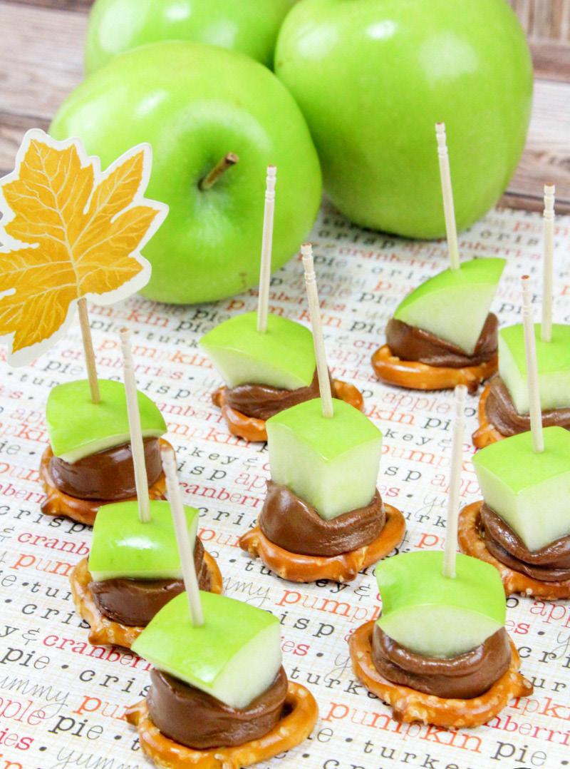 5. Place one apple on the end of a toothpick and push into one of the Rolo pretzels. Repeat until all the Rolo pretzels have apples.
