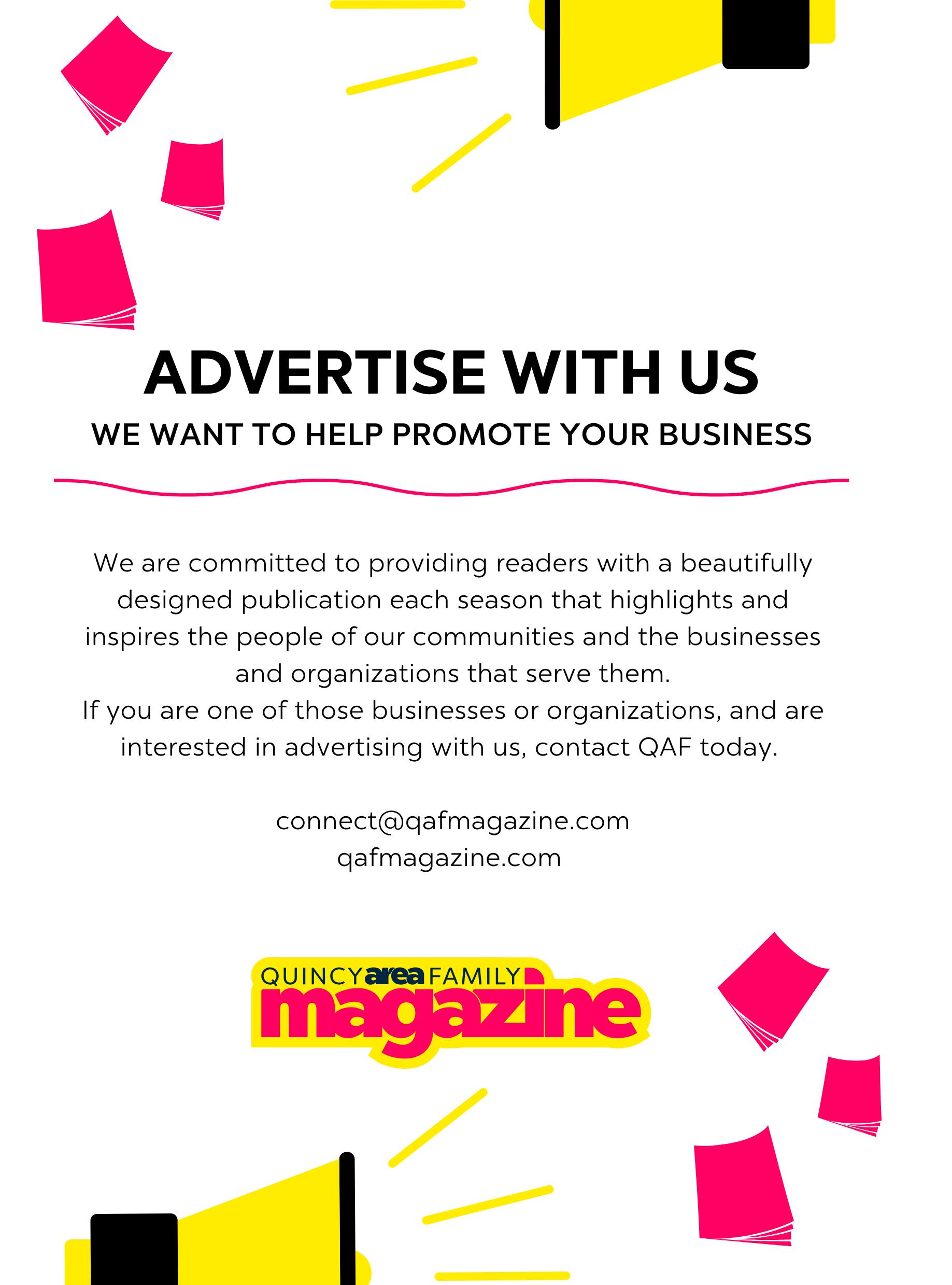 Oh my gosh, it’s here, published, and official. The Quincy Area Family Magazine is something that I have been working on since spring, and I am so excited to share it with you. Although this is not a brand-new publication, it has been rebranded, taking a bit of a different path from the first publications in 2019. So, a big shout out to Kirstin with Rae Design for her patience and speedy work, as I know my timeline request was a bit tight. I also want to thank my advisory board, who you can read more about on page 4, for helping me, guiding me, and busting butt when I requested changes or assistance in a rapid turnaround. Everyone has contributed in one way or another, and I am forever grateful they decided to join me.