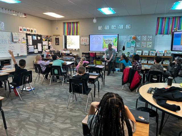 happened, how the process was for him. They were working on narratives. He talked about the process and how many times he had to rework, redo, fix, and the illustrations. Then he asked for someone to tell him their favorite animal. He asked someone else to share what they really like to do, and then they wrote a story together in class. He went home and typed it and sent it back to the class. It’s fun because he’s almost like the kids. The kids are trying to learn and he’s sharing all he’s gone through, and you see it being reflected in their work. More kids were redoing illustrations than we’ve ever had, and it was related to him and how he had to redo his work. It’s been really fun to see how he comes to the classroom and works with the kids and the effects it had on them.”