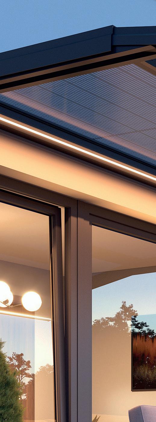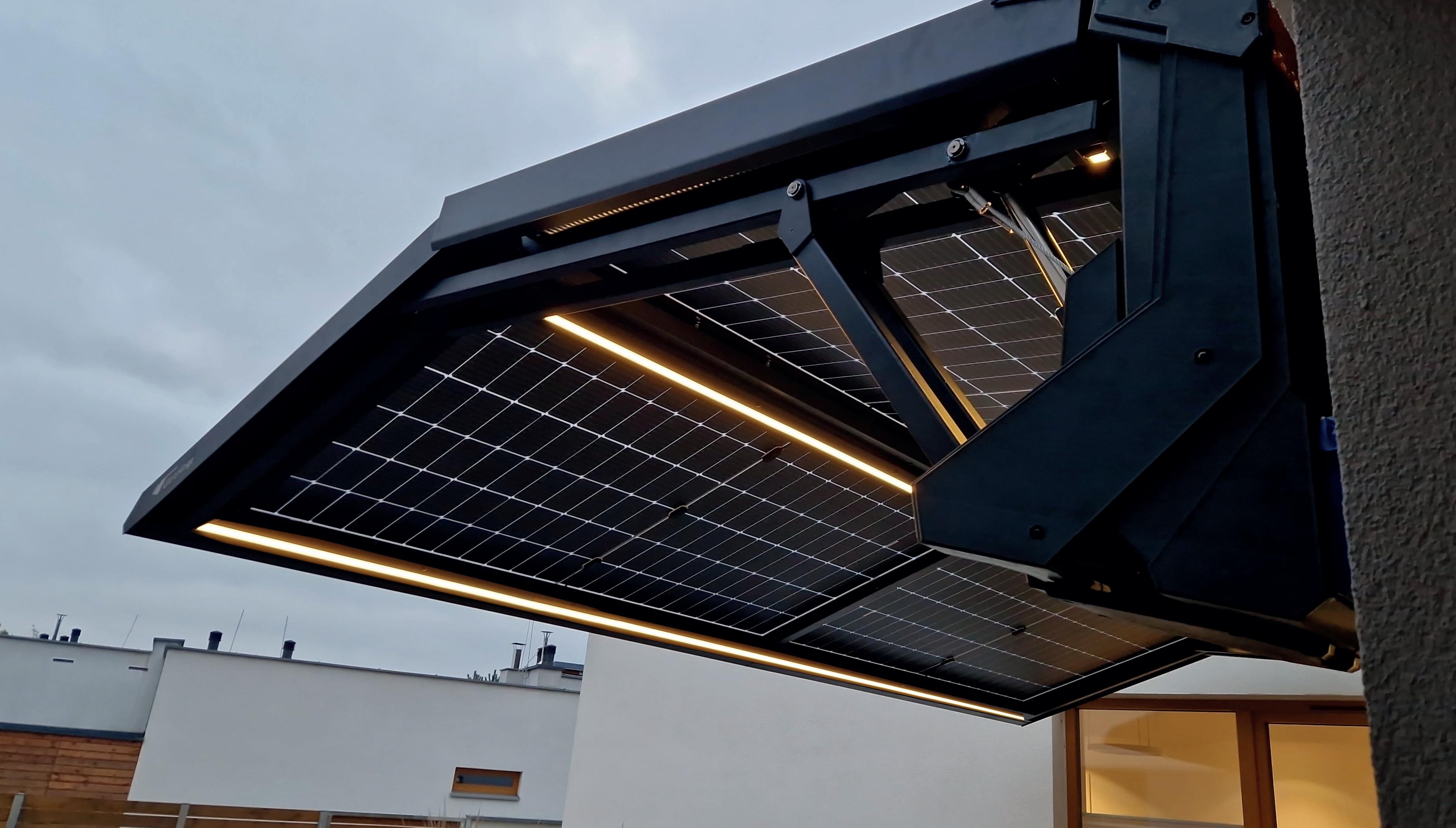 Sensors track wind conditions, and when speeds exceed 36 km/h, the system automatically retracts, ensuring safety and durability. Smart Hom e integration allows remote control of the canopy, energy output, and LED lighting via a smartphone or remote control.