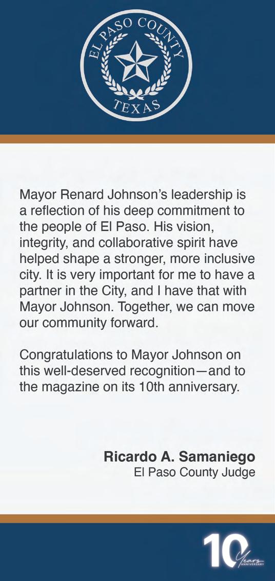 Mayor Johnson’s leadership represents a new chapter for El Paso—a city that has grown with dignity, inclusion, and vision, always grounded in its binational character. His presence on our cover is more than symbolic: it is a recognition of the transformative moment our region is experiencing and of the importance of continuing to foster cultural, social, and economic dialogue that transcends borders.