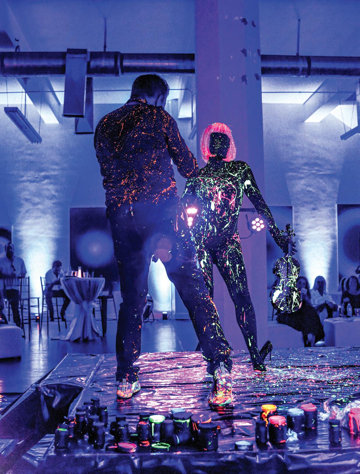 Desde su llegada, Santoscoy conquistó a los asistentes con su técnica inconfundible: trazos fluorescentes, luz negra y una energía creativa que se sincronizaba con los beats del DJ Omar Blancas. El público, fascinado, permanecía expectante mientras el artista intervenía en vivo a las modelos Fabiola Salayandia y Daysi Aguirre, quienes, con una imponente presencia escénica, se convirtieron en lienzos vivientes bajo las manos del artista. Líneas, puntos y patrones emergían al compás de la música, creando una obra efímera e hipnotizante.