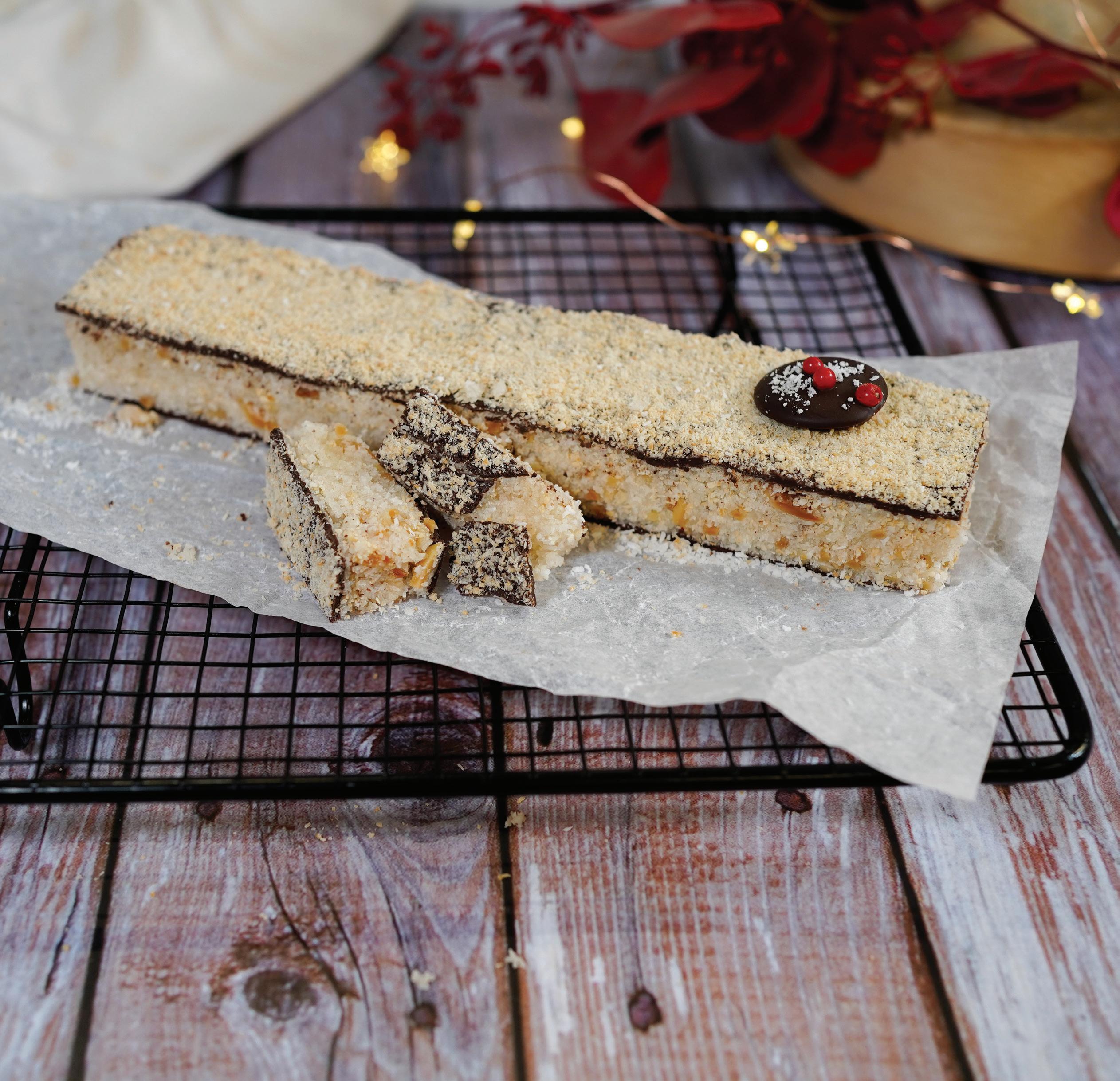 TURRÓN DE COCO, CHOCOLATE 60%, PIMIENTA ROSA Y ALMENDRA