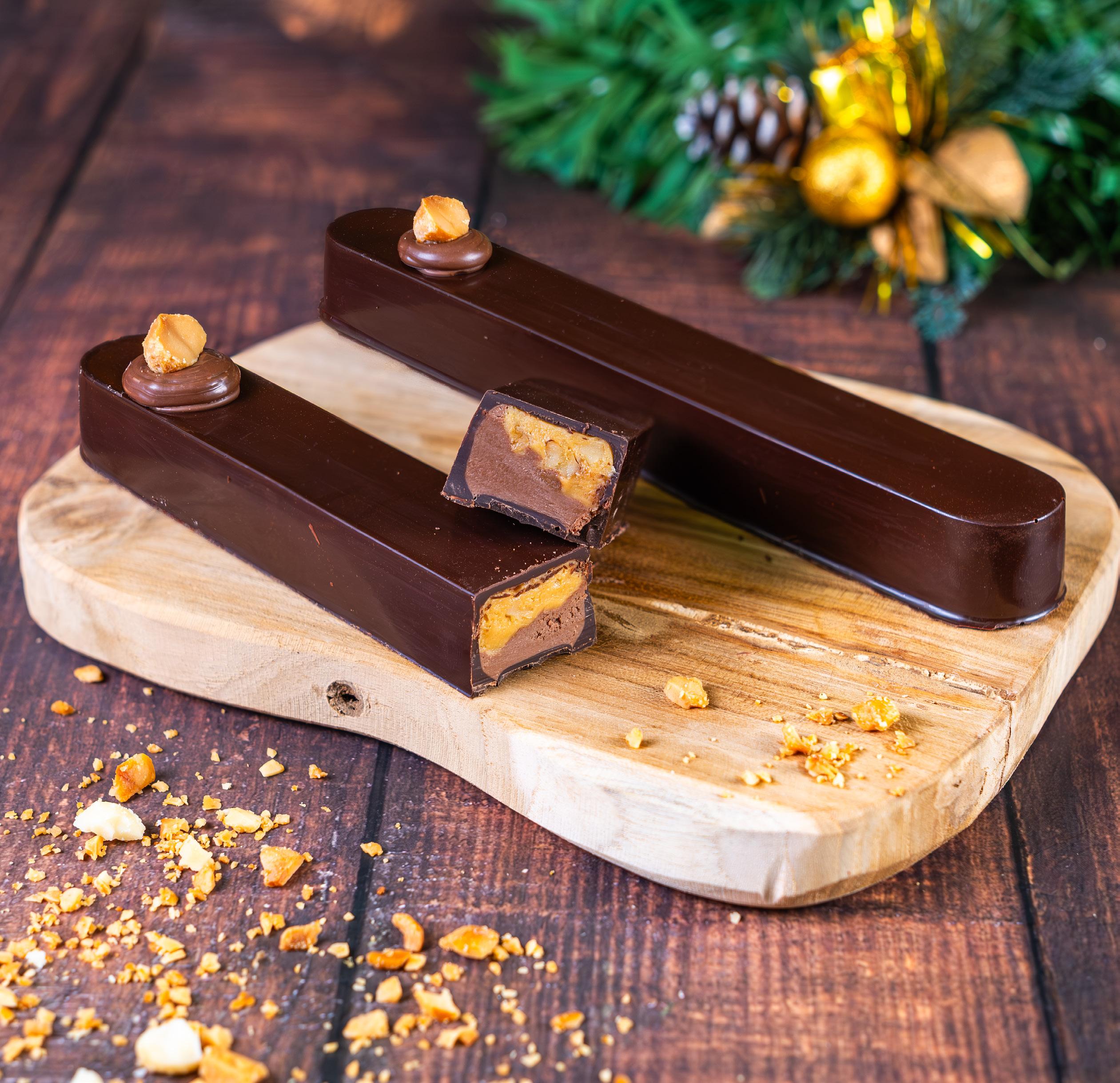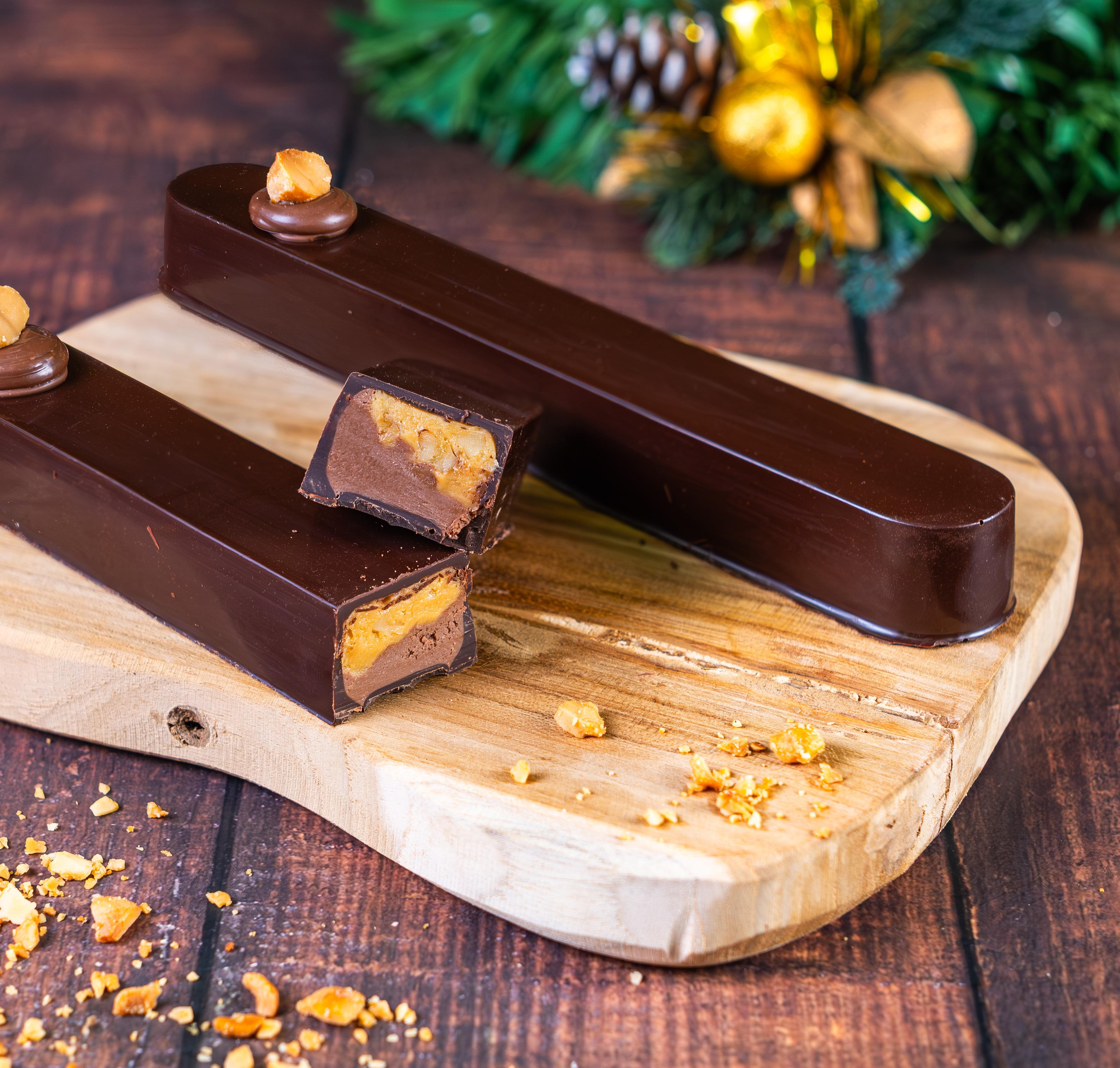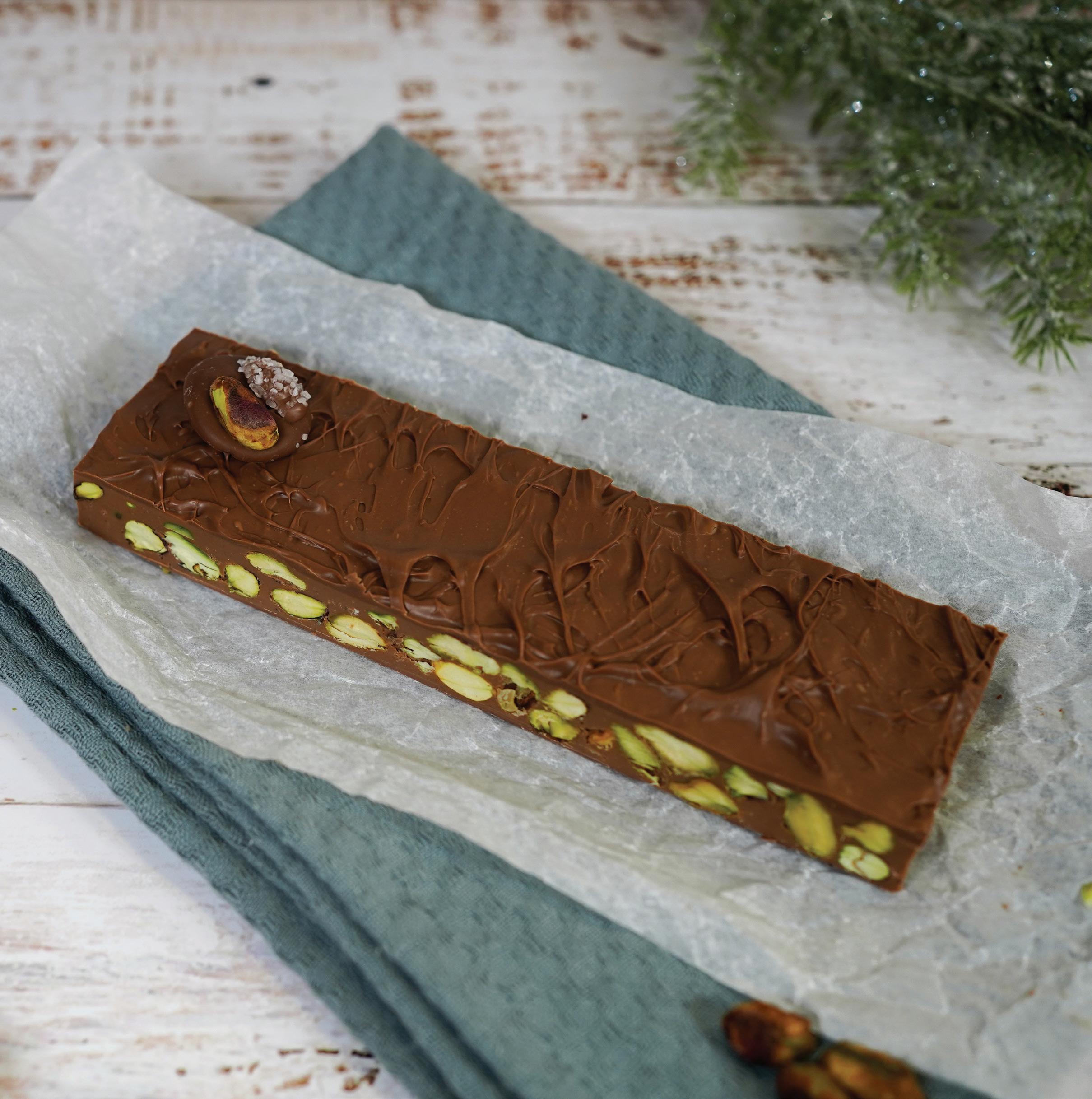 Turrón de gianduja de avellana, pistachos a la sal y chocolate del 70%.