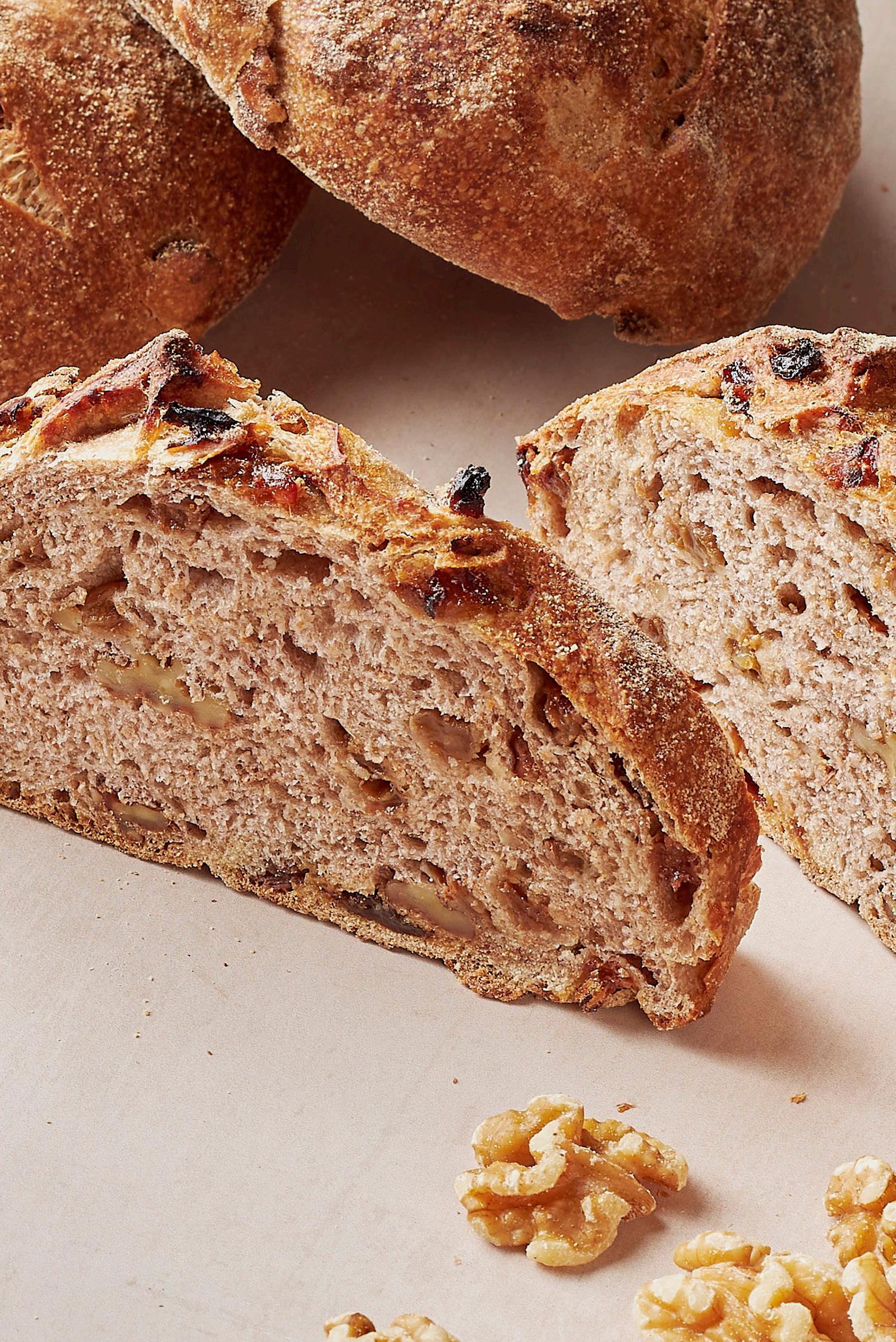 Se for difícil, convém realizar uma dobra e ir incluindo as nozes e passas com paciência. Após um repouso de 45 minutos, formar peças de 300 g e bolear (ou deixar uma só peça). Deixar um tempo à parte até que duplique o seu volume.