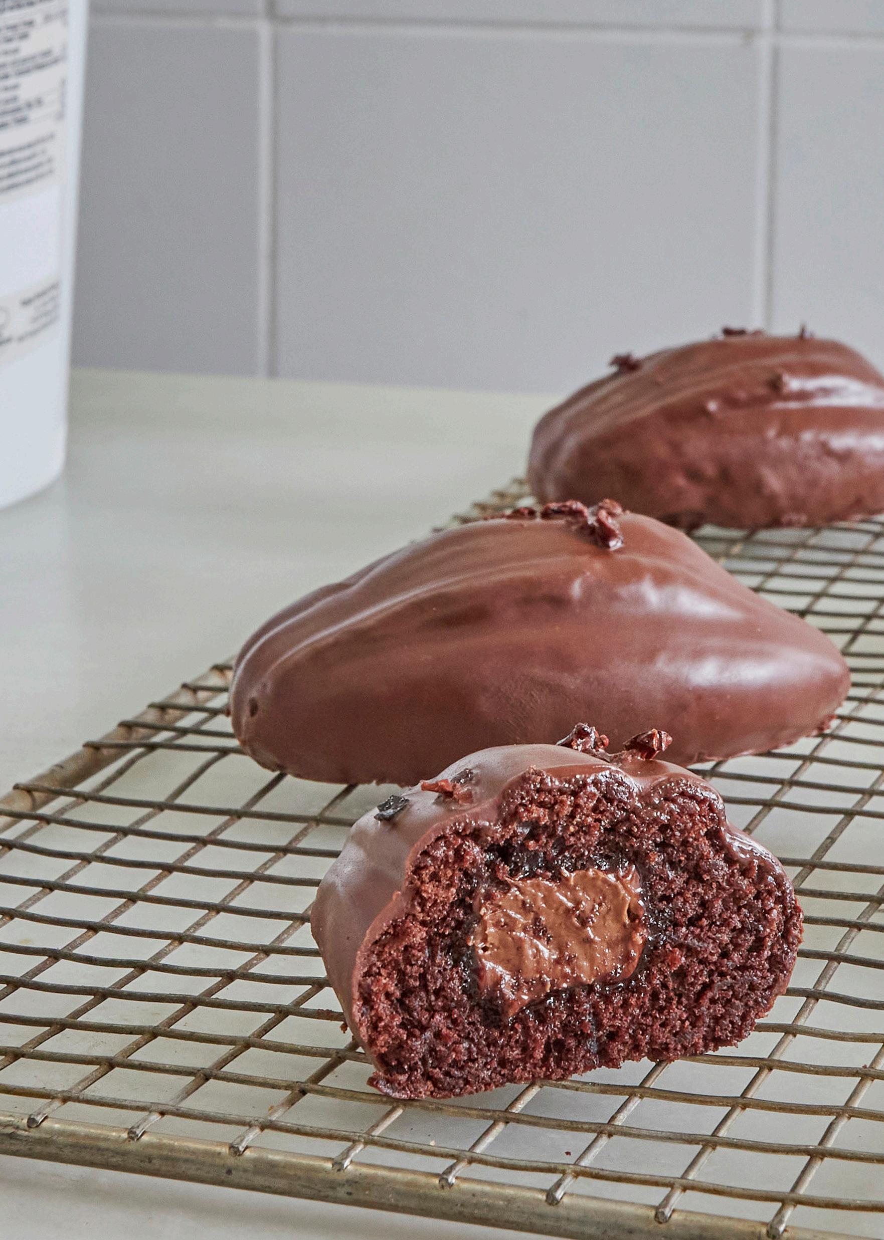 Encher as formas com o formato da fava do cacau com o cake de chocolate e inserir o creme de avelãs e cacau congelado de modo a que fque no centro da forma.